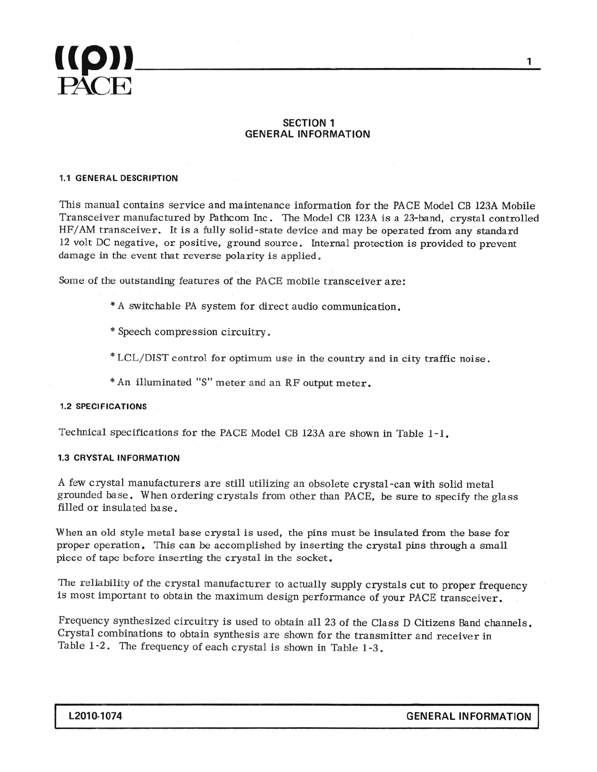 Pace CB 123A - General Information; General Description; Technical Specifications; Crystal Information