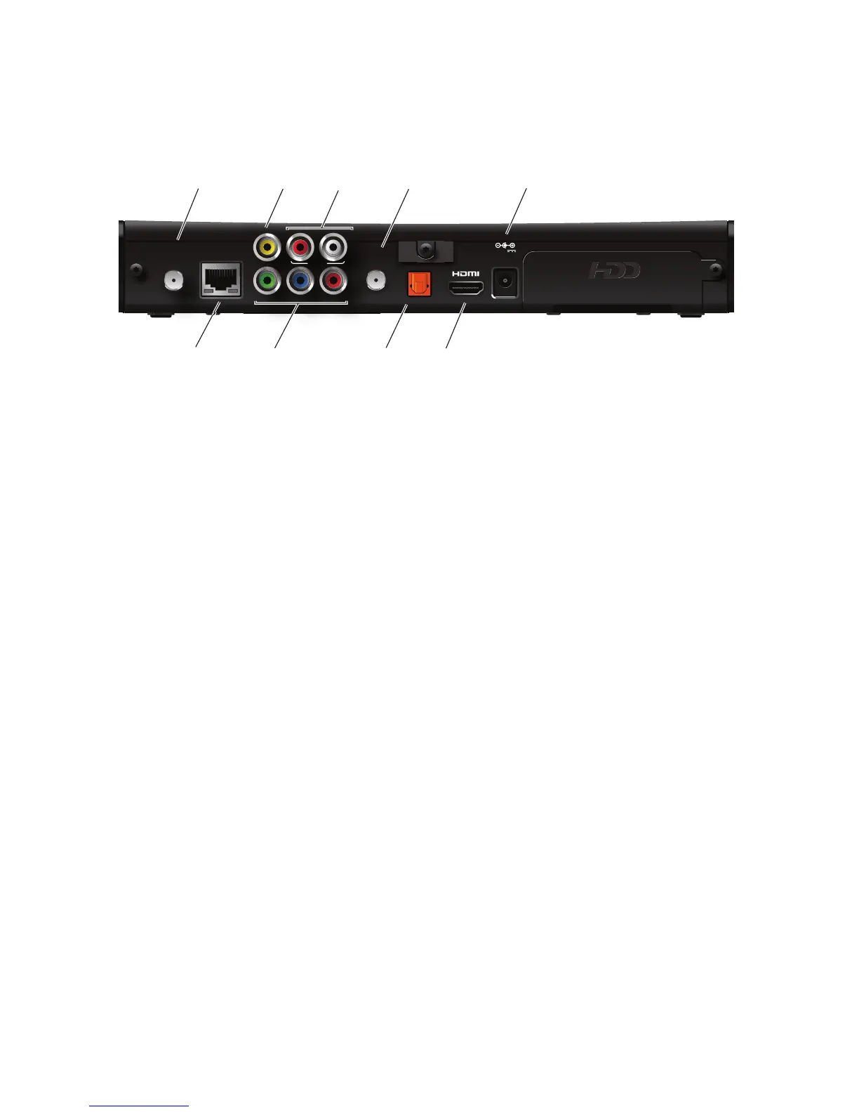 The following illustration shows the ports and connectors on the back of the receiver.