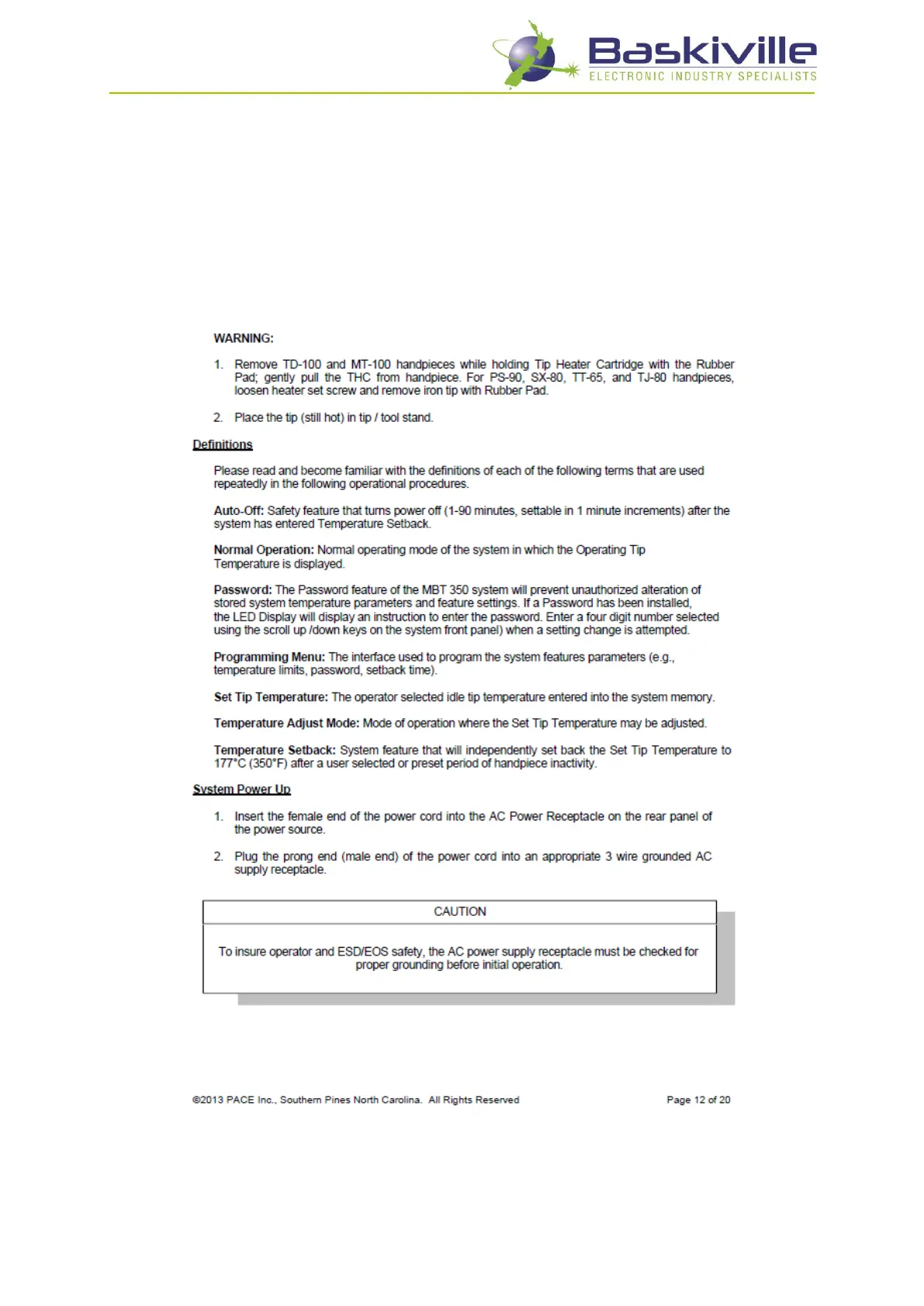 Pace MBT 350 - Operation Basics and Definitions; Tip Removal Warning; Operational Definitions; System Power Up