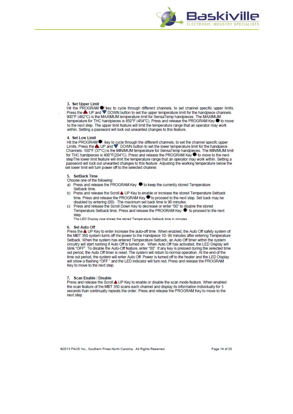 Pace MBT 350 - Programming Menu Options; Setting Temperature Limits; Temperature Setback and Auto Off; Scan Mode Enable;Disable