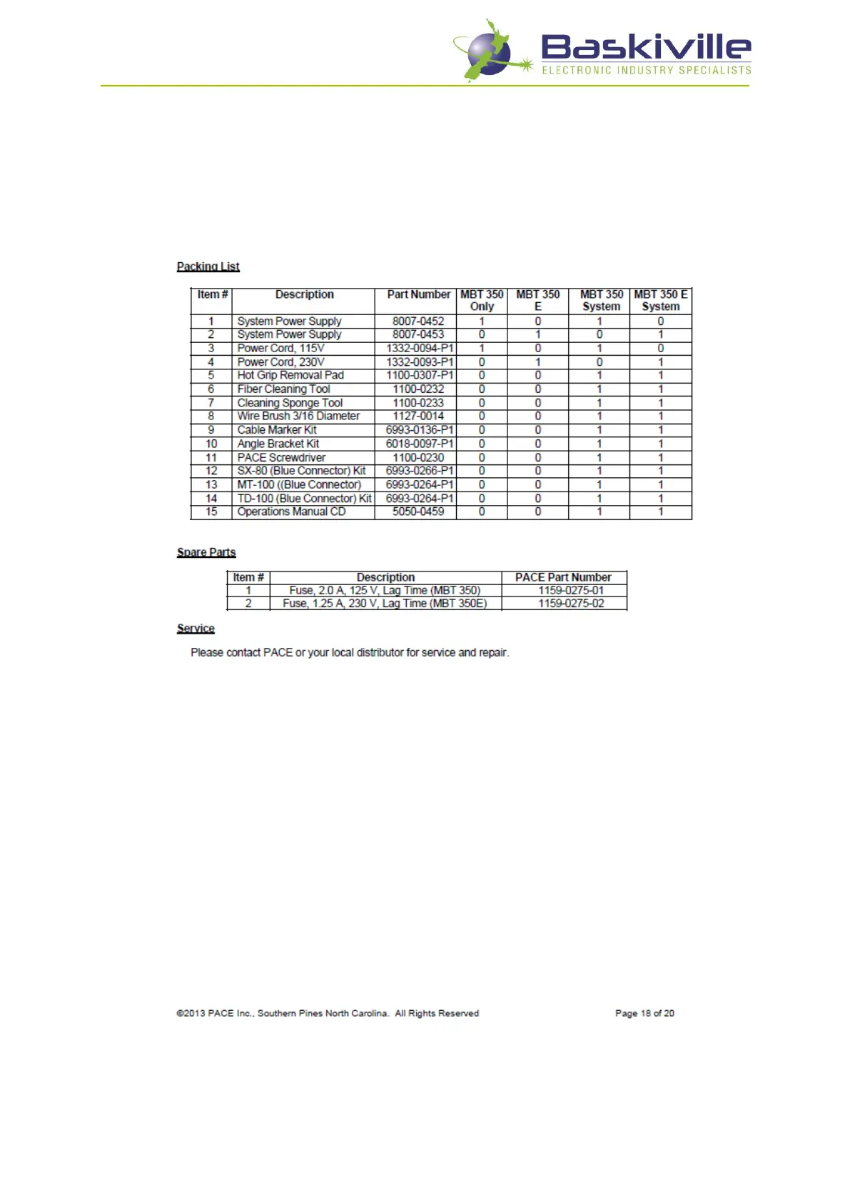 Pace MBT 350 - Packing, Spares, and Service; Packing List; Spare Parts; Service and Repair