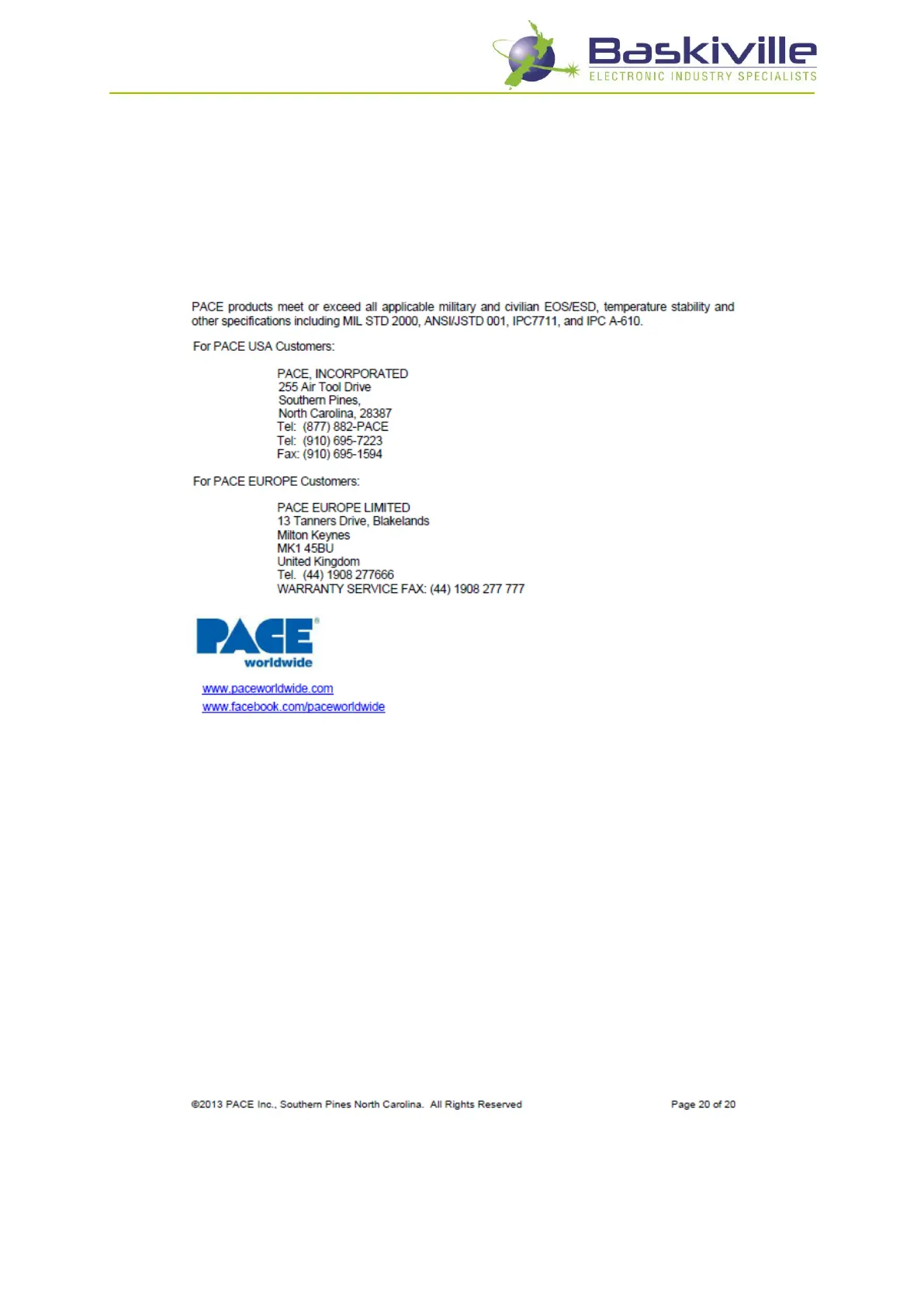 Pace MBT 350 - Contact and Compliance; PACE Contact Information; Product Compliance Standards