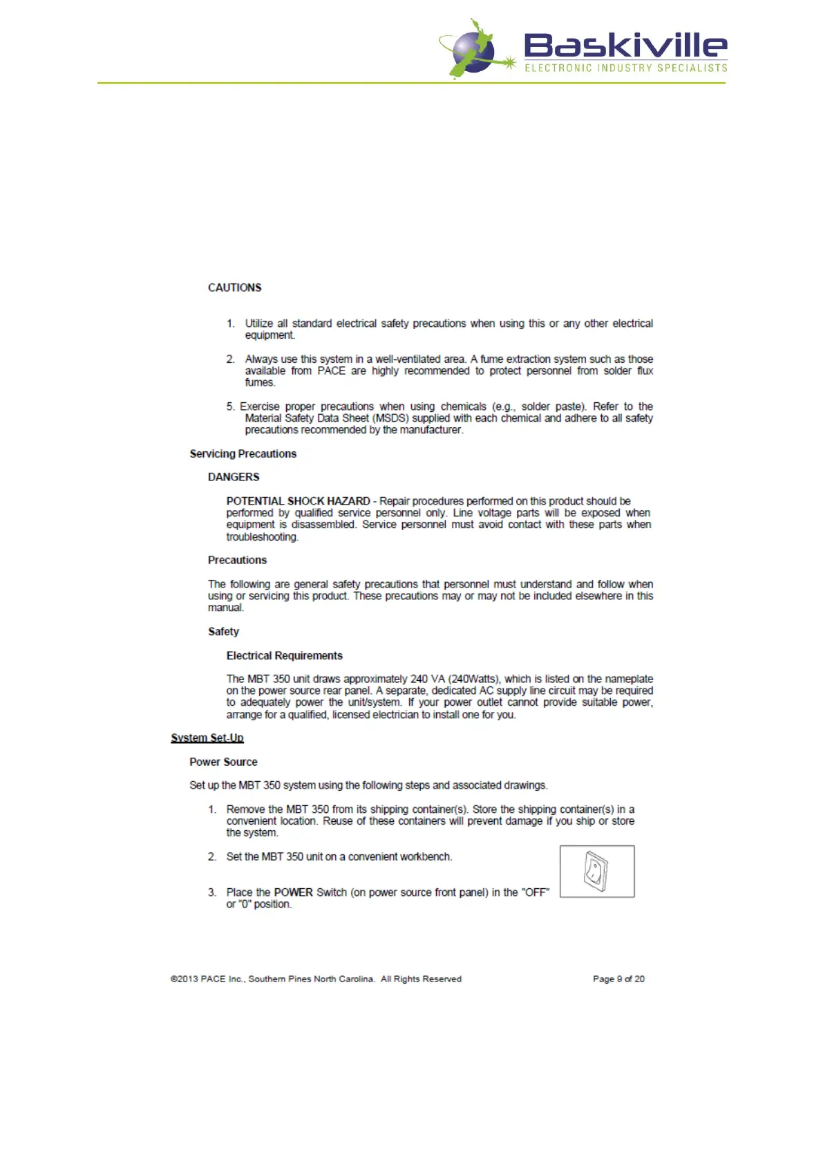 Pace MBT 350 - Precautions and System Setup; Cautions and Servicing Precautions; Electrical Requirements; Power Source Setup