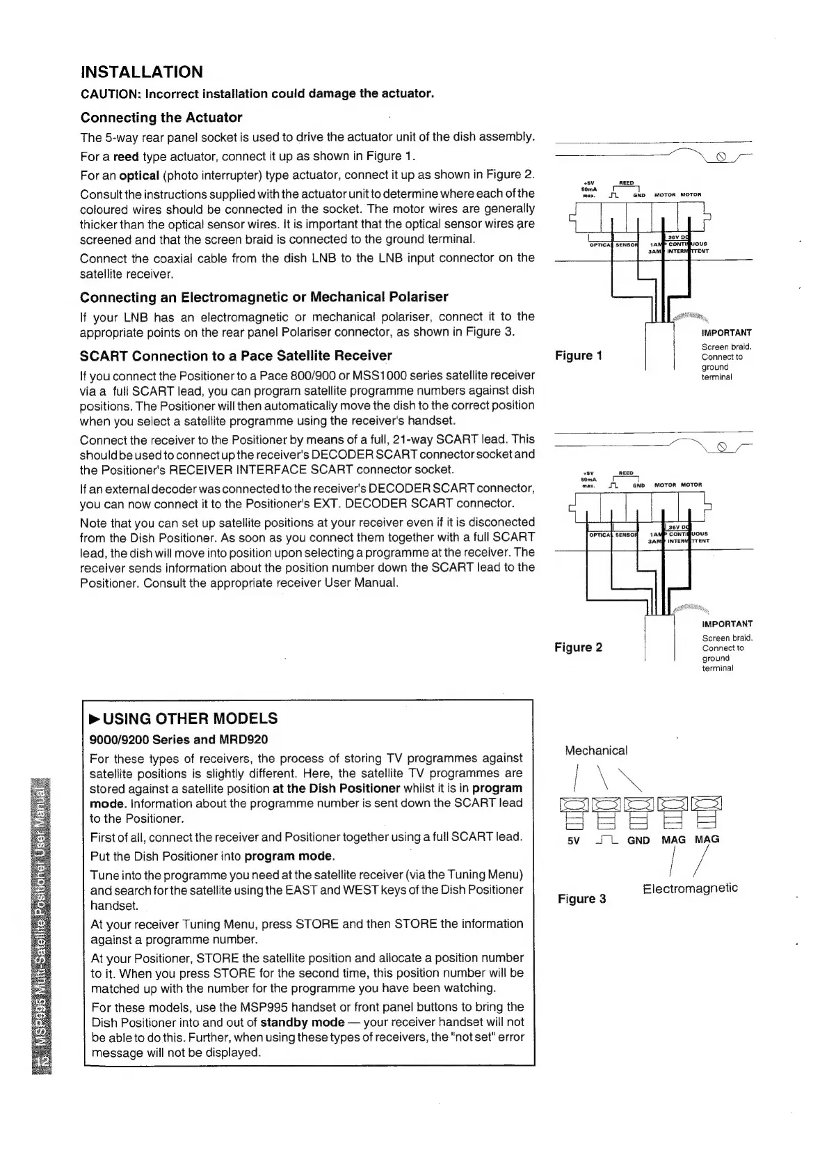 Pace MSP 995 - INSTALLATION AND COMPATIBILITY; Connecting the Dish Actuator; Connecting the Polariser; SCART Connection to Pace Receiver