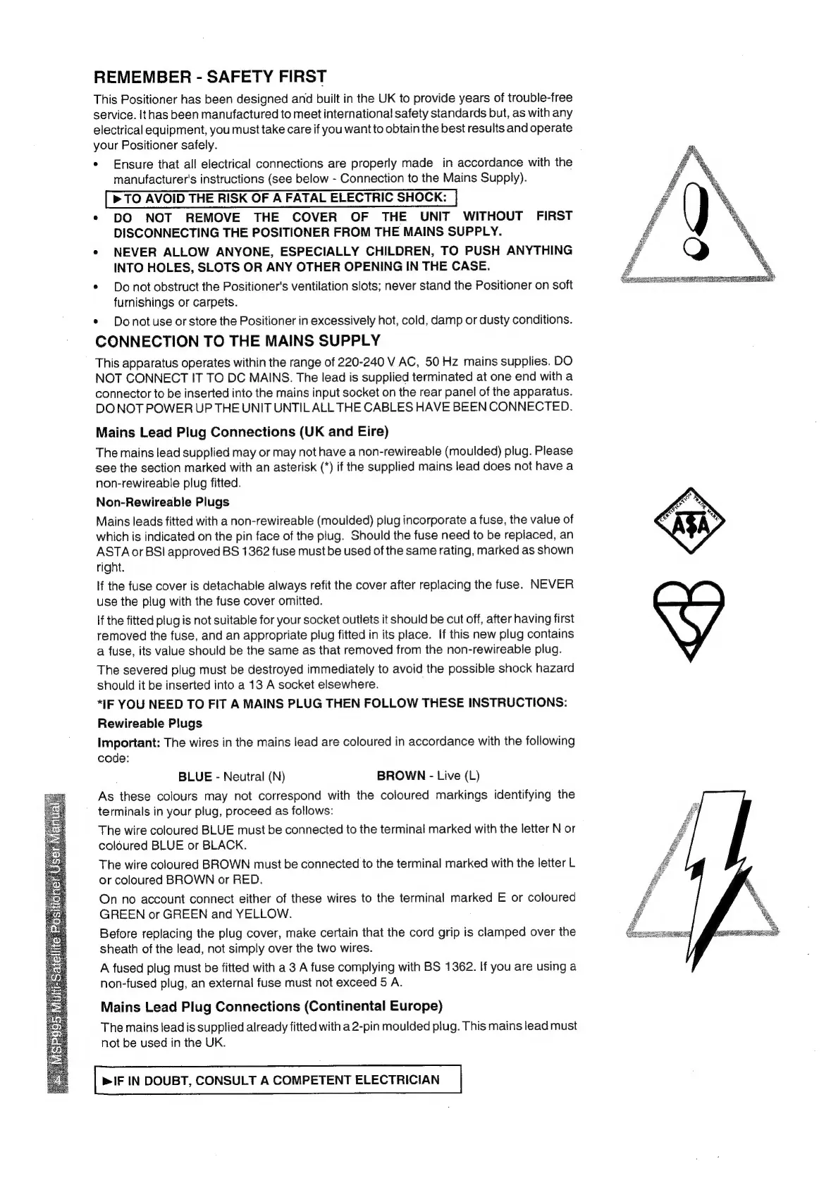 Pace MSP 995 - SAFETY AND POWER CONNECTION; Safety First Precautions; Mains Supply Connection; Mains Lead Plug Fitting