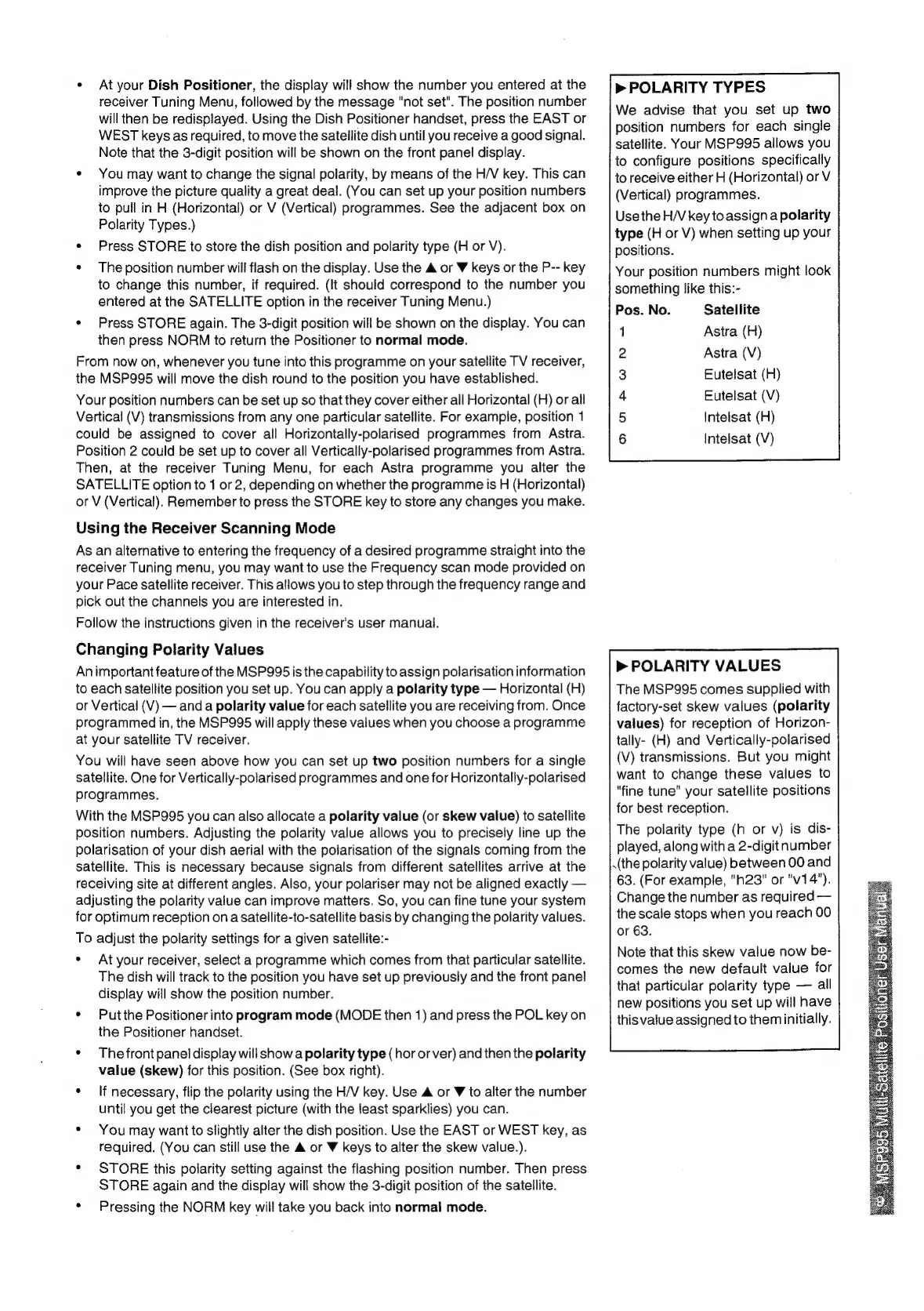 Pace MSP 995 - SATELLITE POSITION CONFIGURATION; Receiver Scanning Mode Usage; Adjusting Polarity Values; Understanding Polarity Types