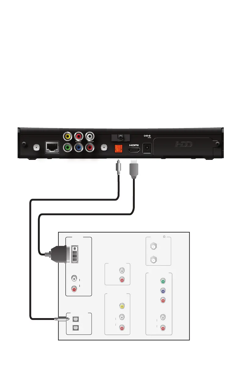 HDMI-to-DVI cable and a separate digital optical audio cable.