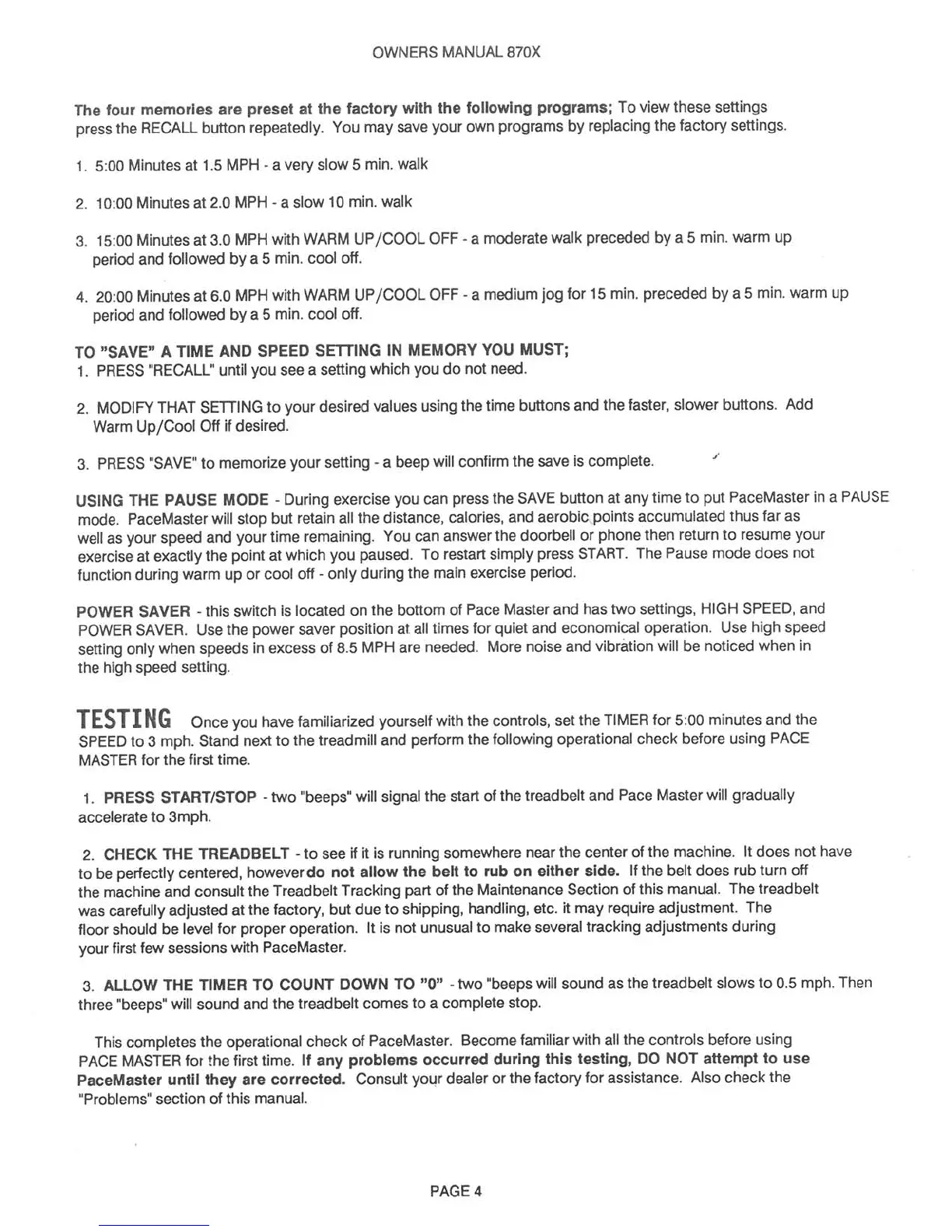 PaceMaster 870X - Testing and Fitness Programs; Pre-Use Operational Check; Factory Preset Workouts