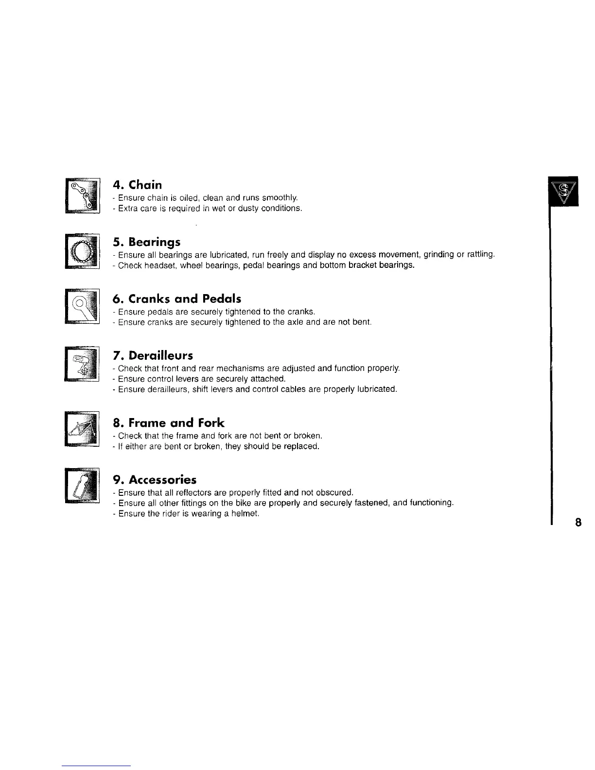 - Ensure all other fittings on the bike are properly and securely fastened, and functioning.