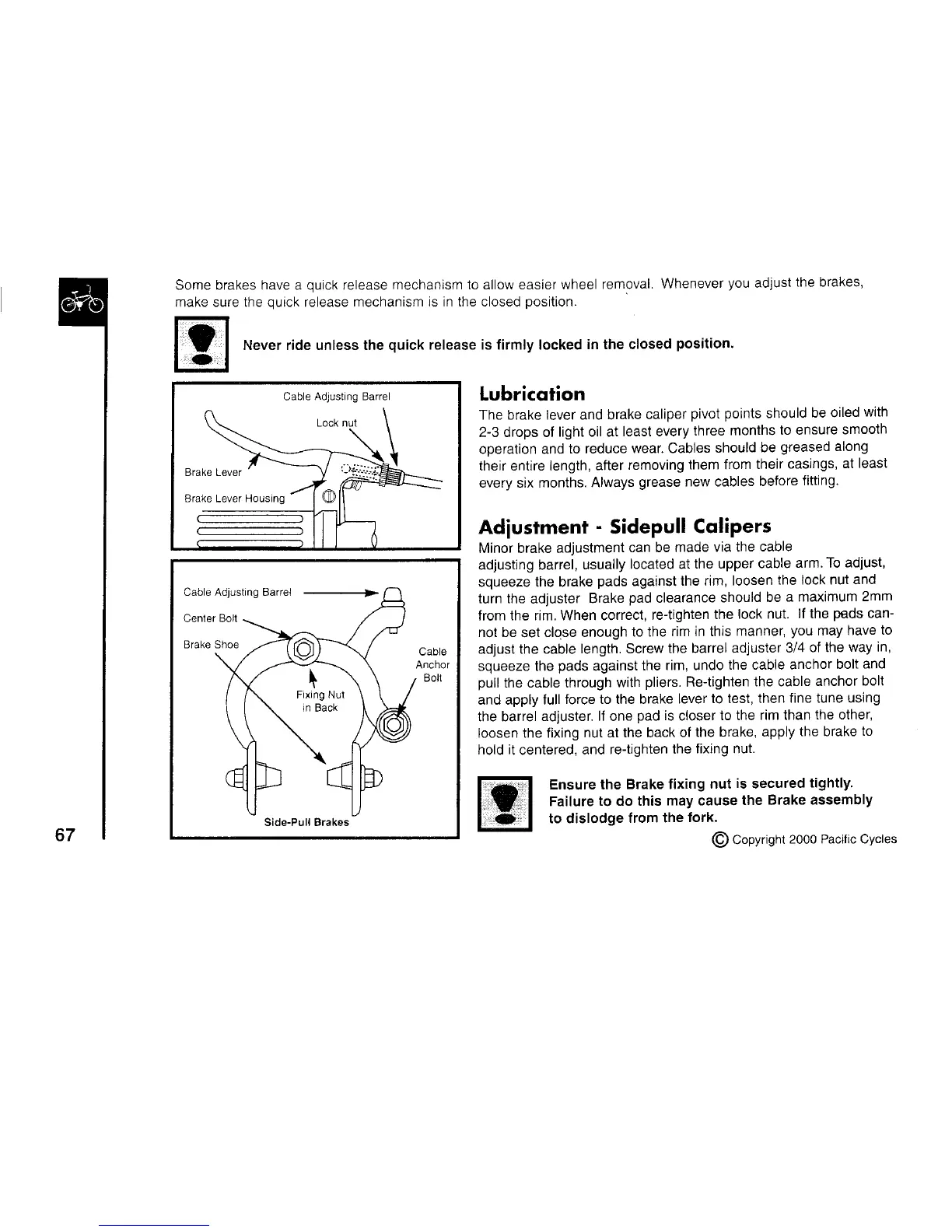 Some brakes have a quick release mechanism to allow easier wheel removal. Whenever you adjust the brakes,
