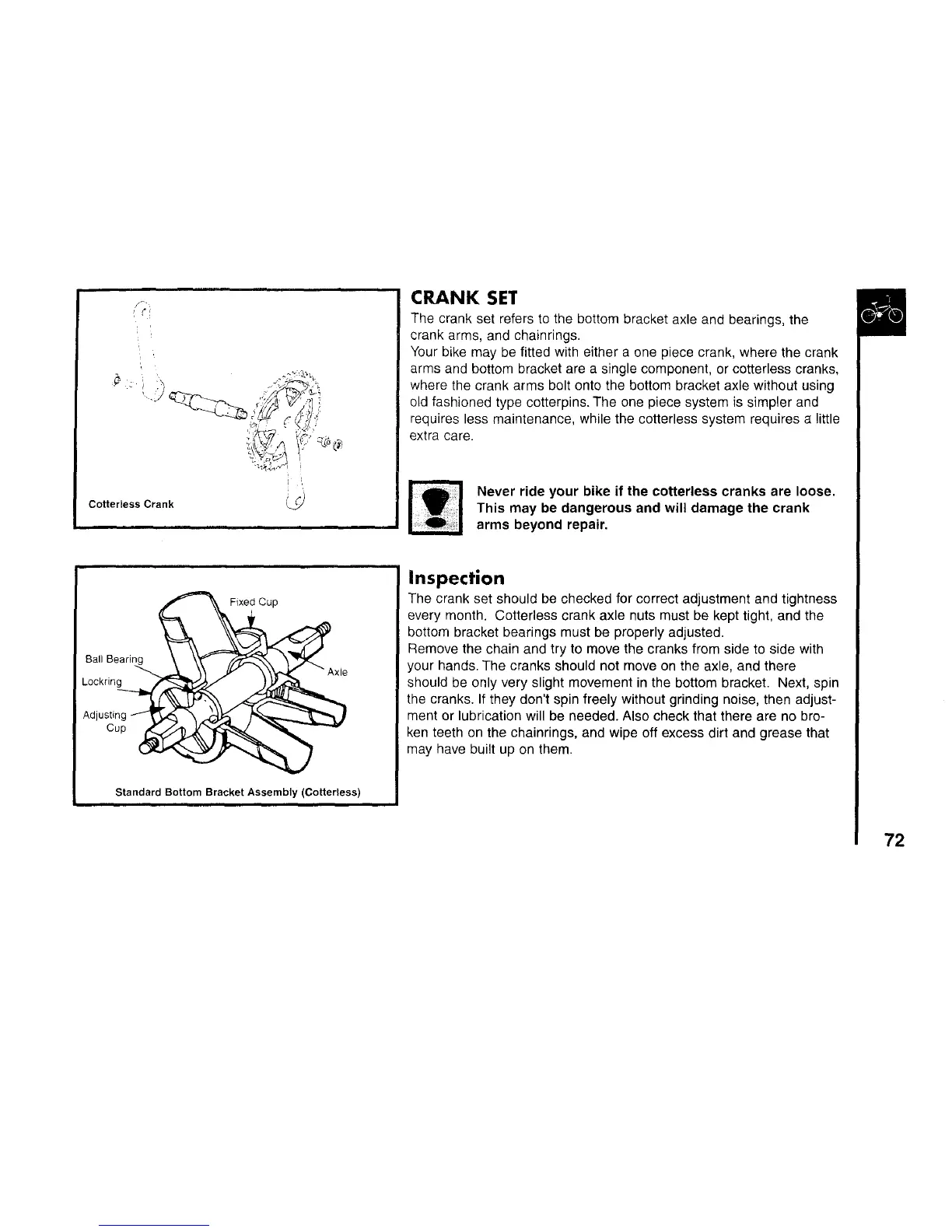 Never ride your bike if the cotterless cranks are loose.