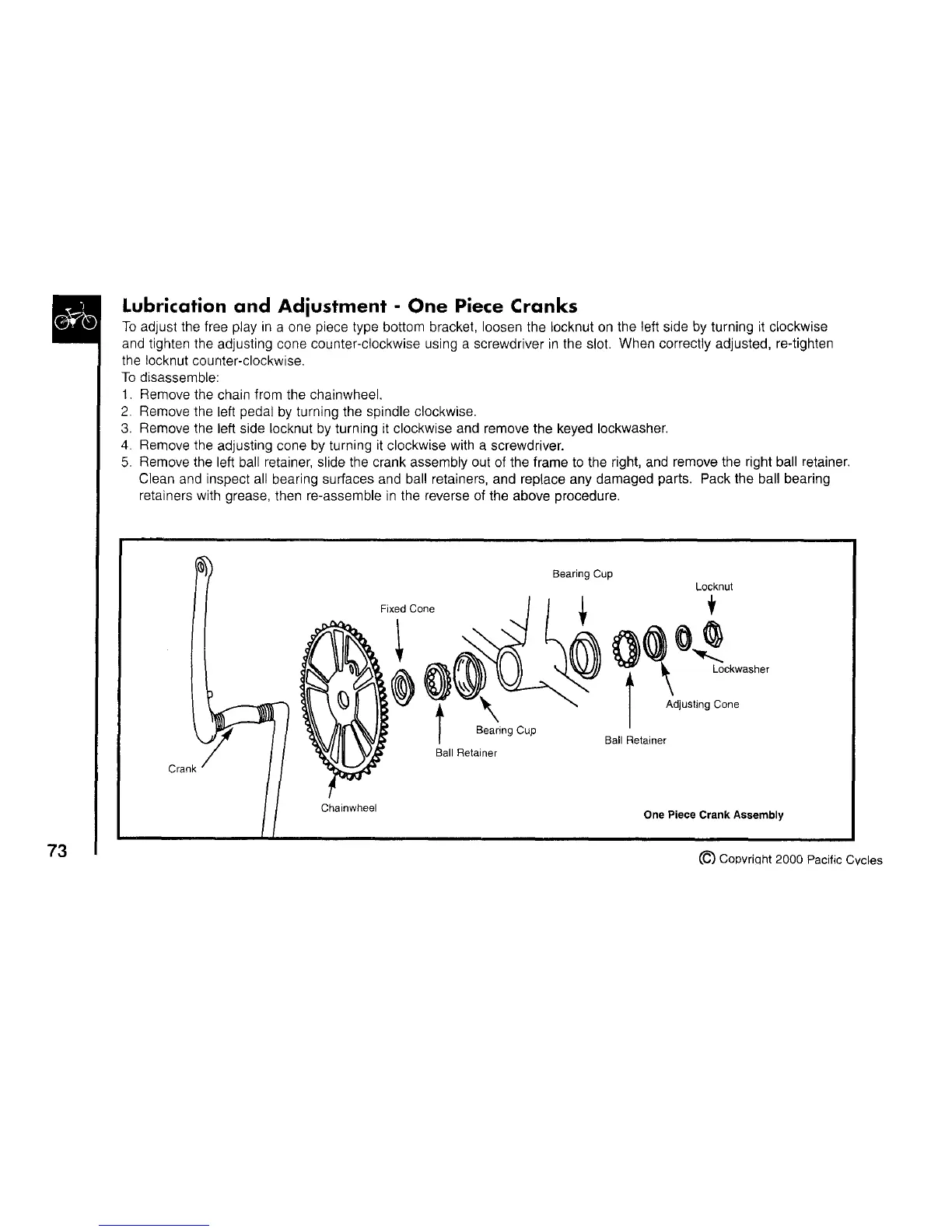 To adjust the free play in a one piece type bottom bracket, loosen the Iocknut on the left side by turning it clockwise