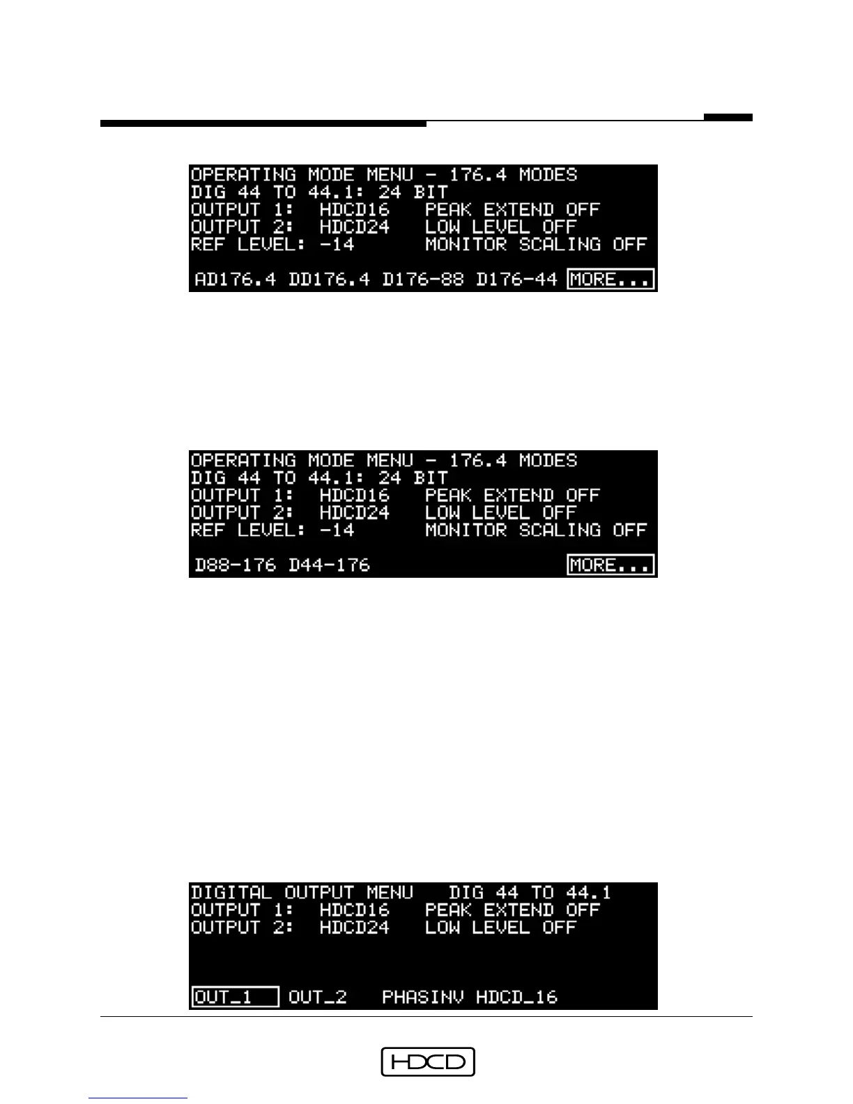 button #4 (D176-44) selects 176.4 kHz to 44.1 kHz DD mode, button #5 (MORE...) selects