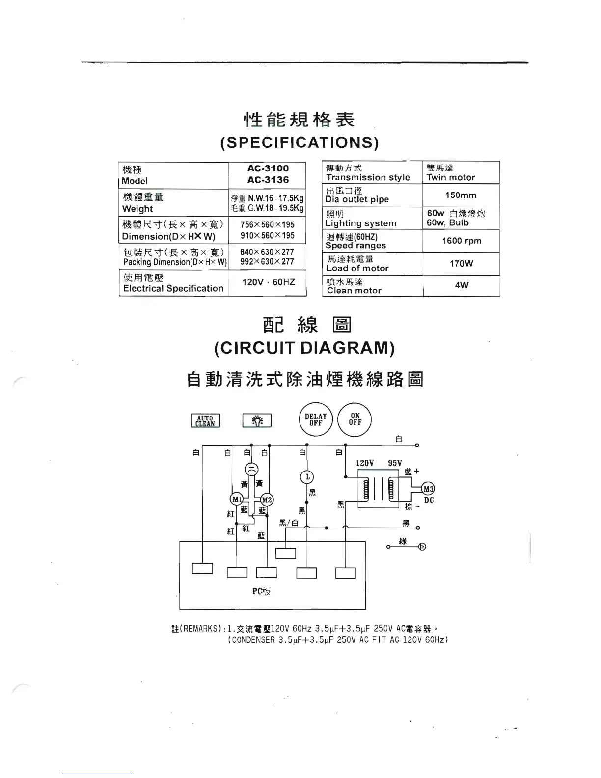Pacific AC-3136 - Product Specifications; Model and Physical Dimensions; Performance Specifications