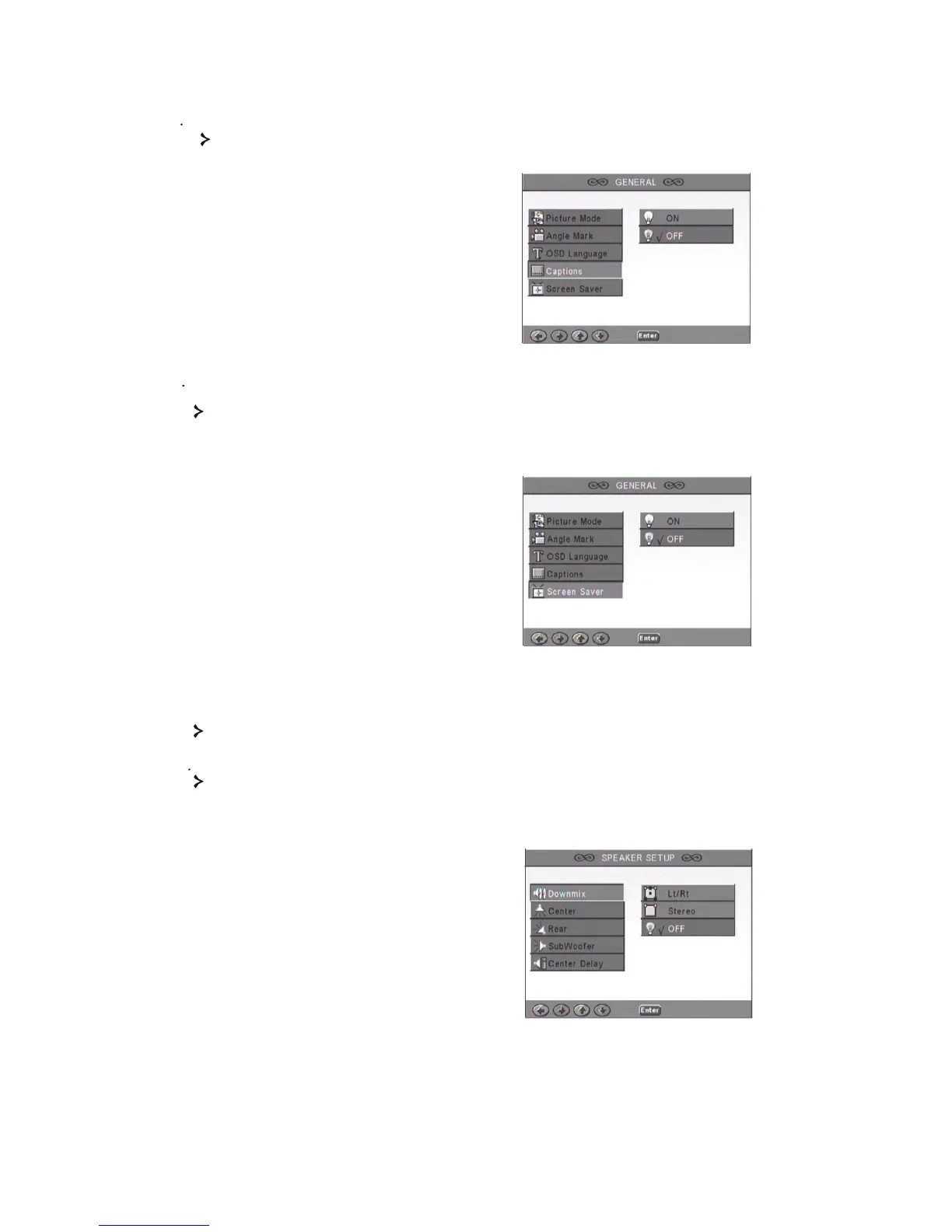 SPEAKER SETUP includes Downmix, Center, Rear, Subwoofer, Center Delay, Rear
