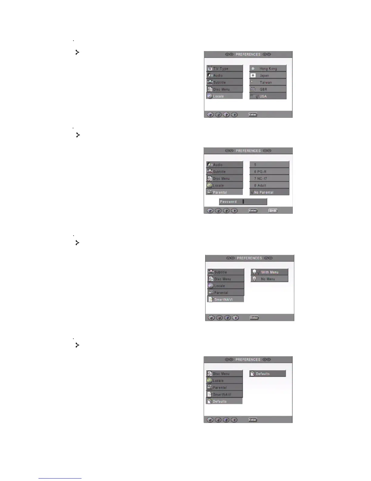 Packard Bell 350 - 7.4.6 Locale Selection; 7.4.7 Parental Lock Level; 7.4.8 SmartNAVI Navigation; 7.4.9 Restore Default Settings