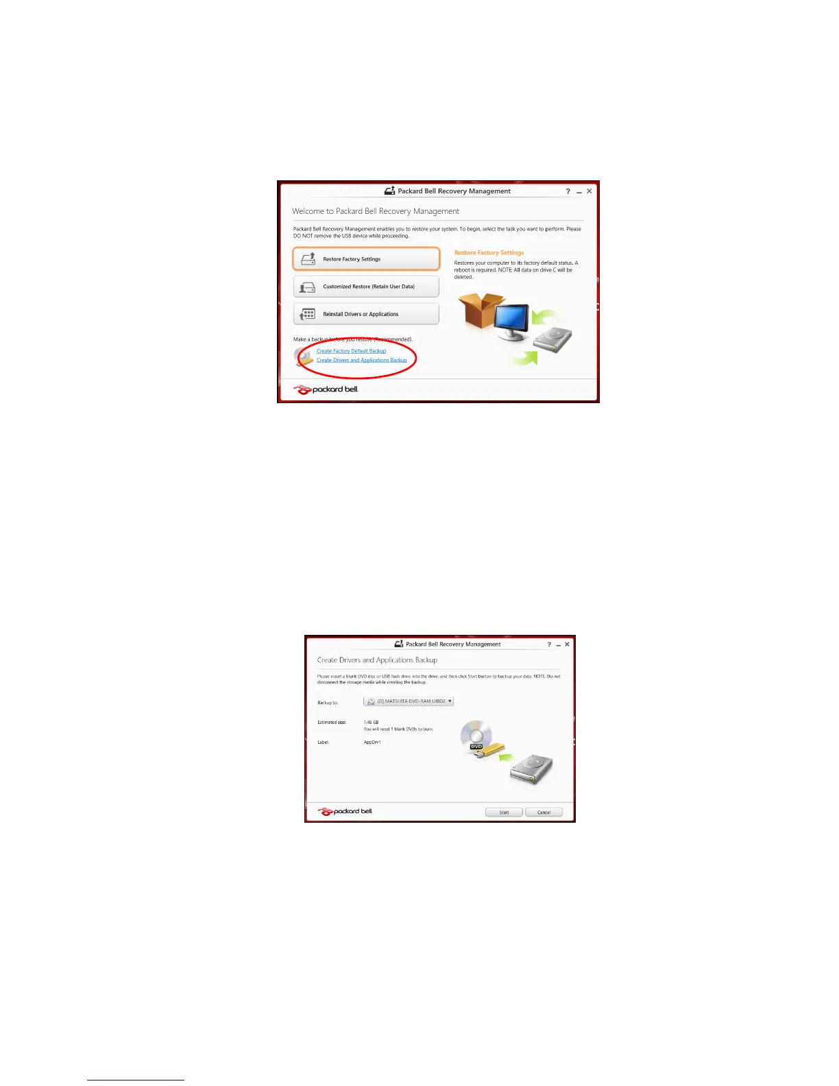 1. From Start, type 'Recovery' and then click Packard Bell Recovery