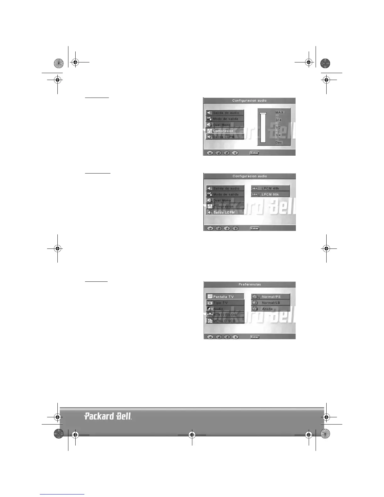 No está accesible durante la reproducción. La página Preferencias incluye Pantalla TV, Tipo TV, Audio,