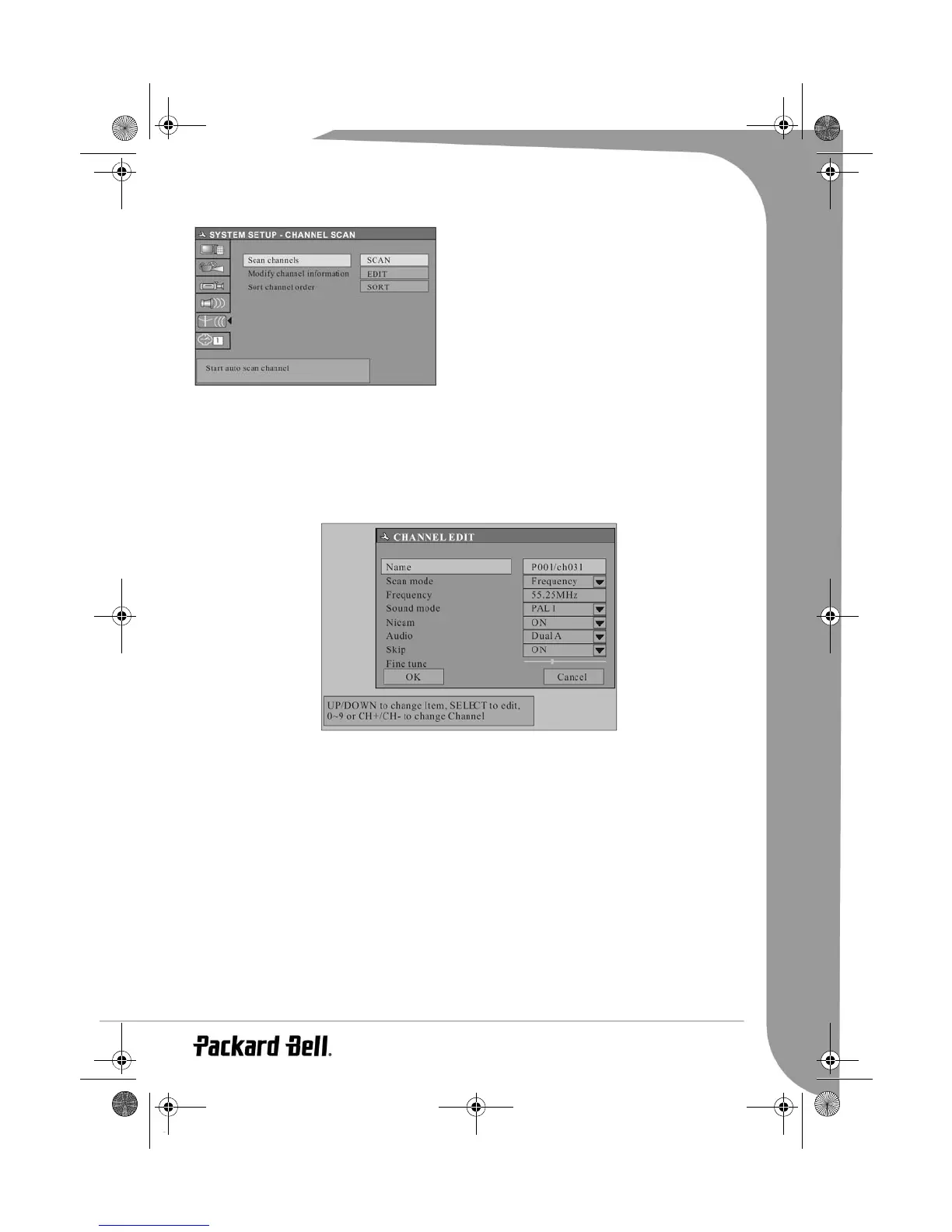 the Up/Down arrow buttons and the SELECT button to select and confirm. The steps of channel edit are as