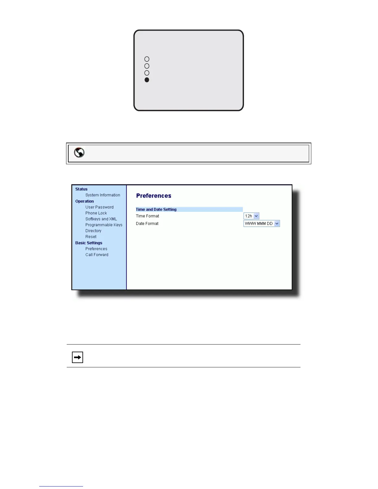 Note: The time and time format you configure display on the phone’s