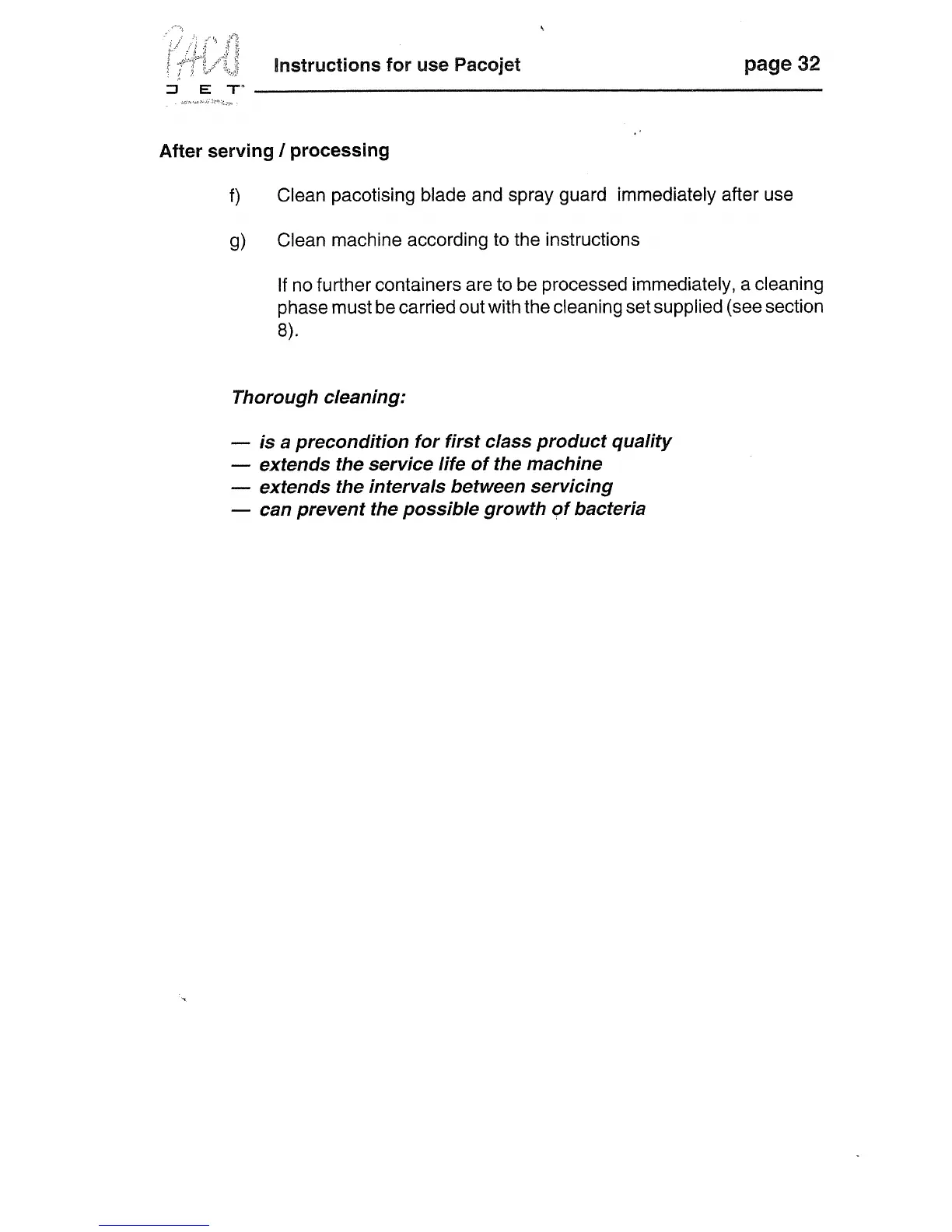 Pacojet PJ1 - Machine Cleaning Procedures; General Cleaning Importance; Cleaning the Direct Processing System
