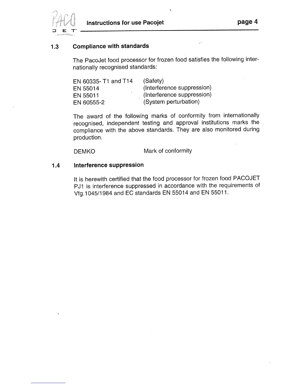 Pacojet PJ1 - Compliance with Standards; Interference Suppression
