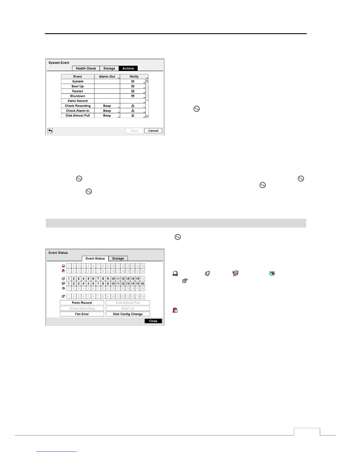 Recording, Check Alarm-In, Disk Almost Full, Disk Full, Disk Bad, Disk Temperature, or Disk S.M.A.R.T.),