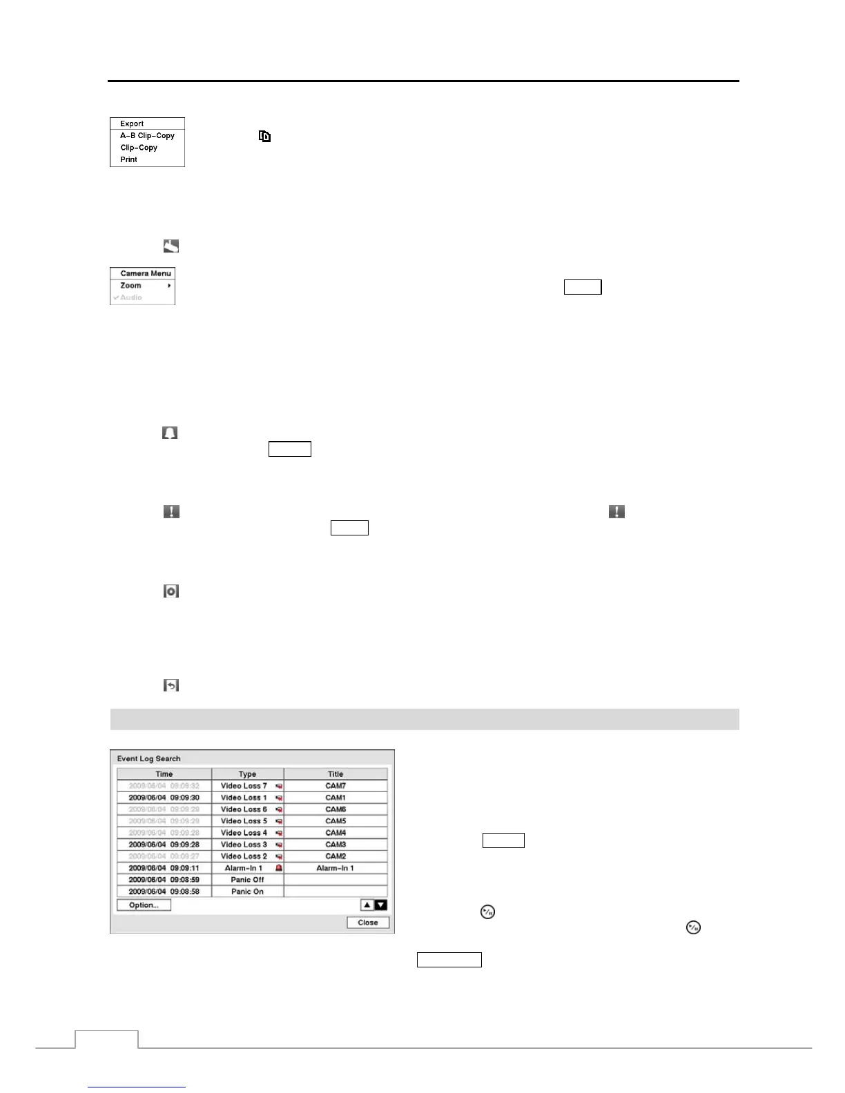 (Alarm Reset) in the Search menu resets the DVR’s outputs including the internal buzzer during an alarm.