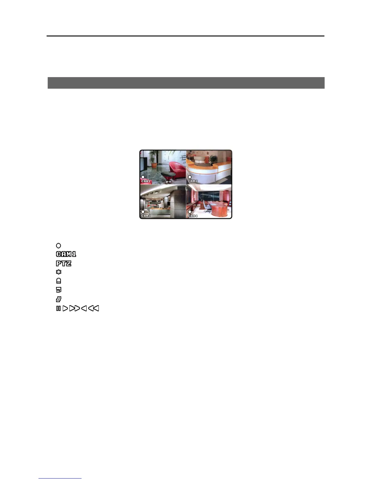 When the DVR operates first, it displays quad screen and starts recording. Refer to Appendix – Factory