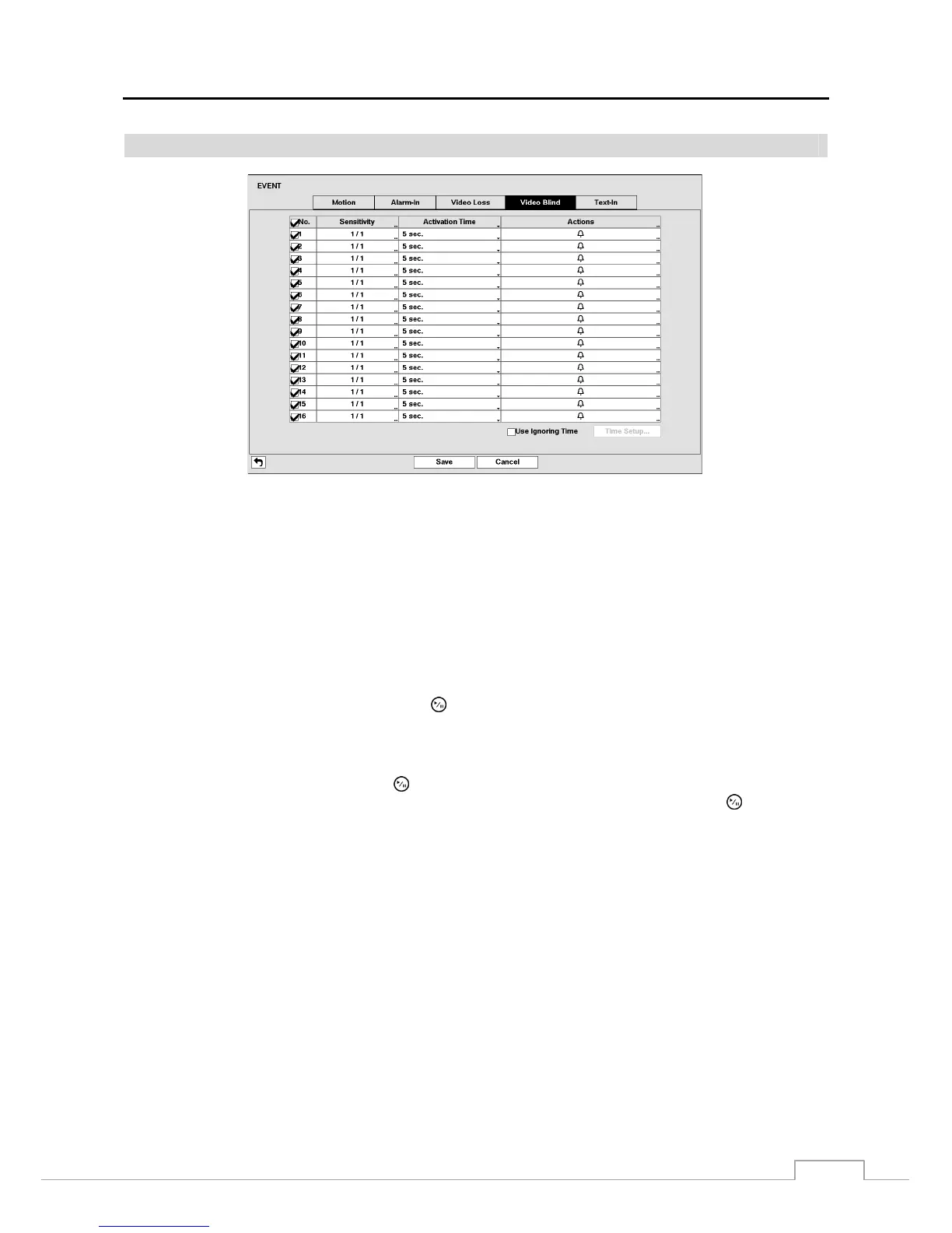 ignore video blind events occurred during the preset period. Highlighting Time Setup and press the