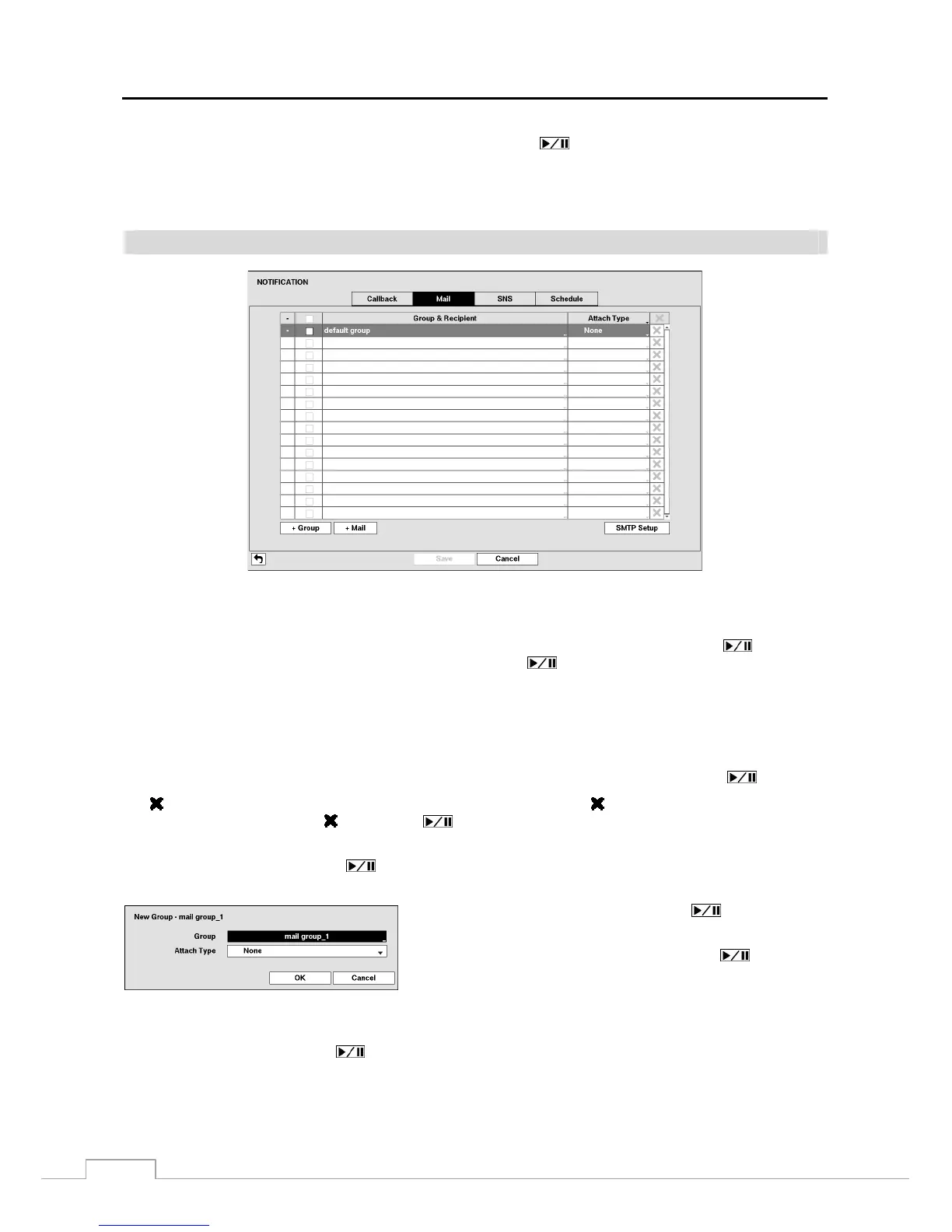 The DVR can be set up to send an email when an event occurs. The Mail Group and Recipient can be turned On or Off