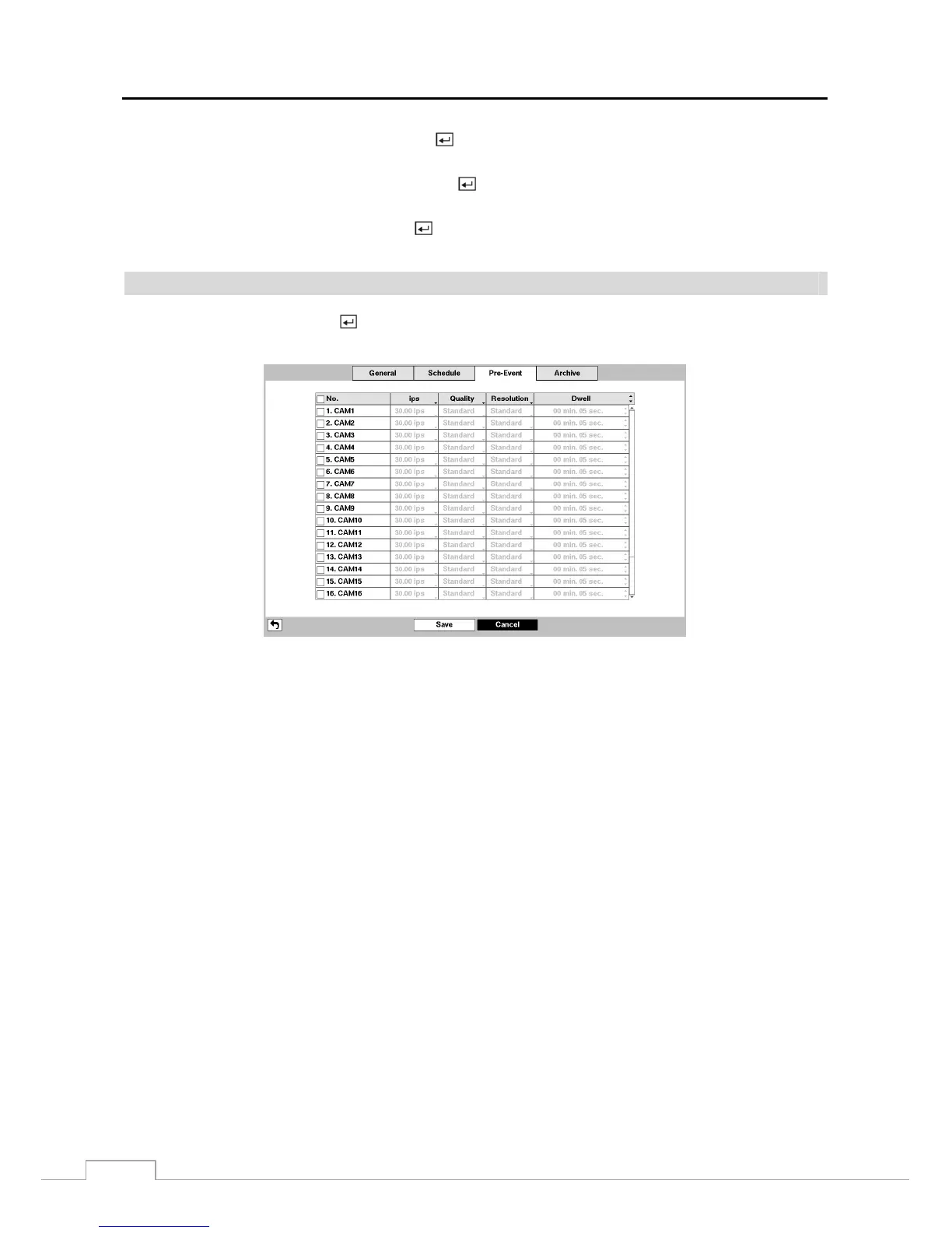You can turn individual cameras On or Off for pre-event recording. The image speed can be set from 1.00 to 30.00 ips
