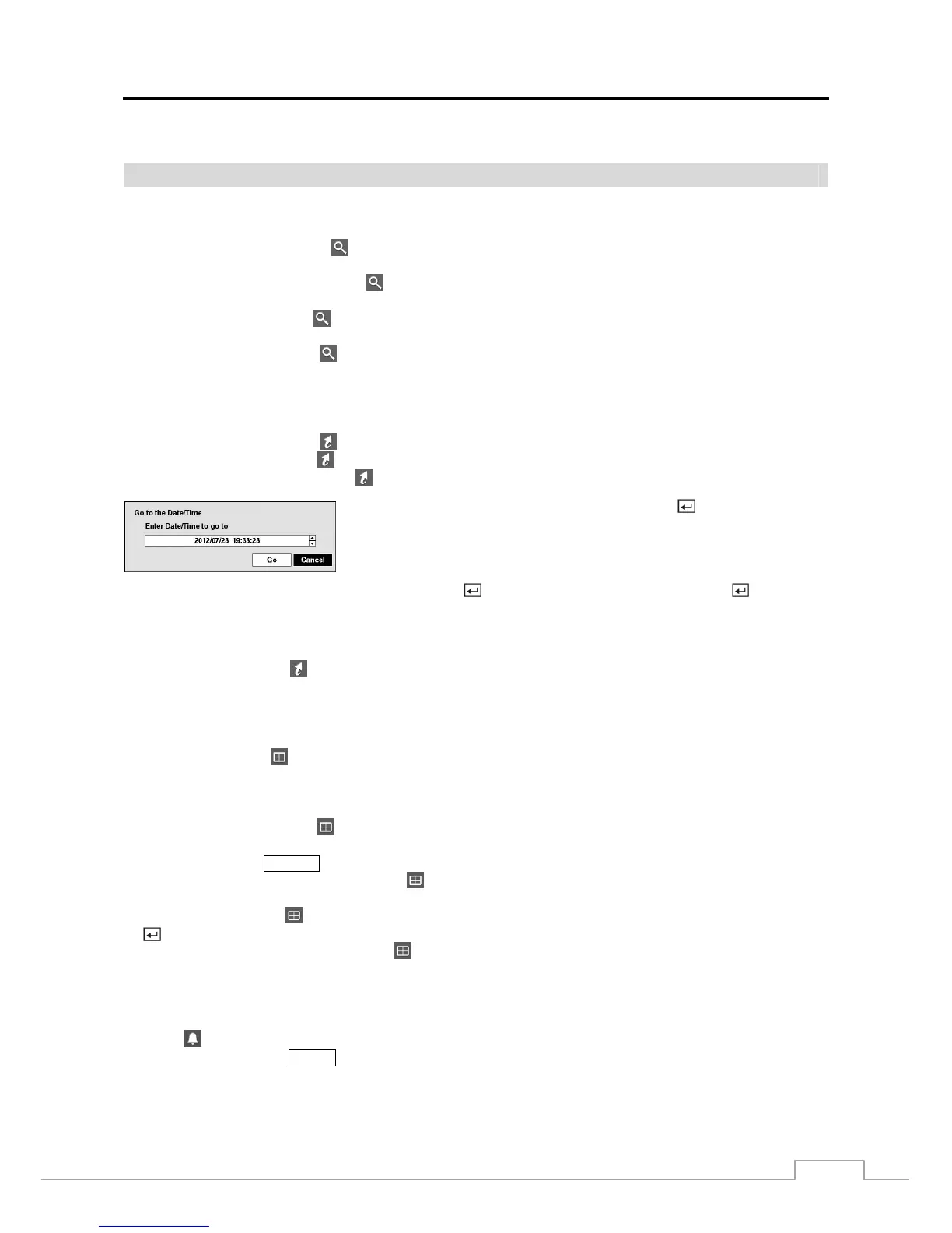 (Alarm) in the Search menu resets the DVR’s outputs including the internal buzzer during an alarm. It