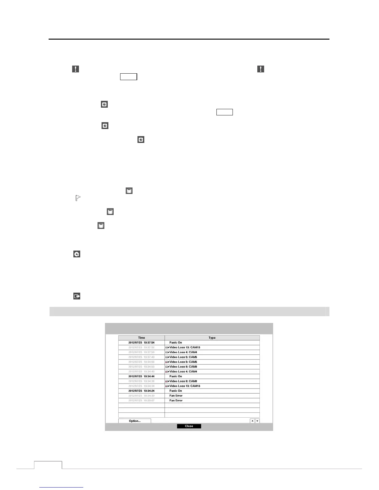 (Panic) in the Search menu starts panic recording of all cameras, and selecting again stops panic recording.