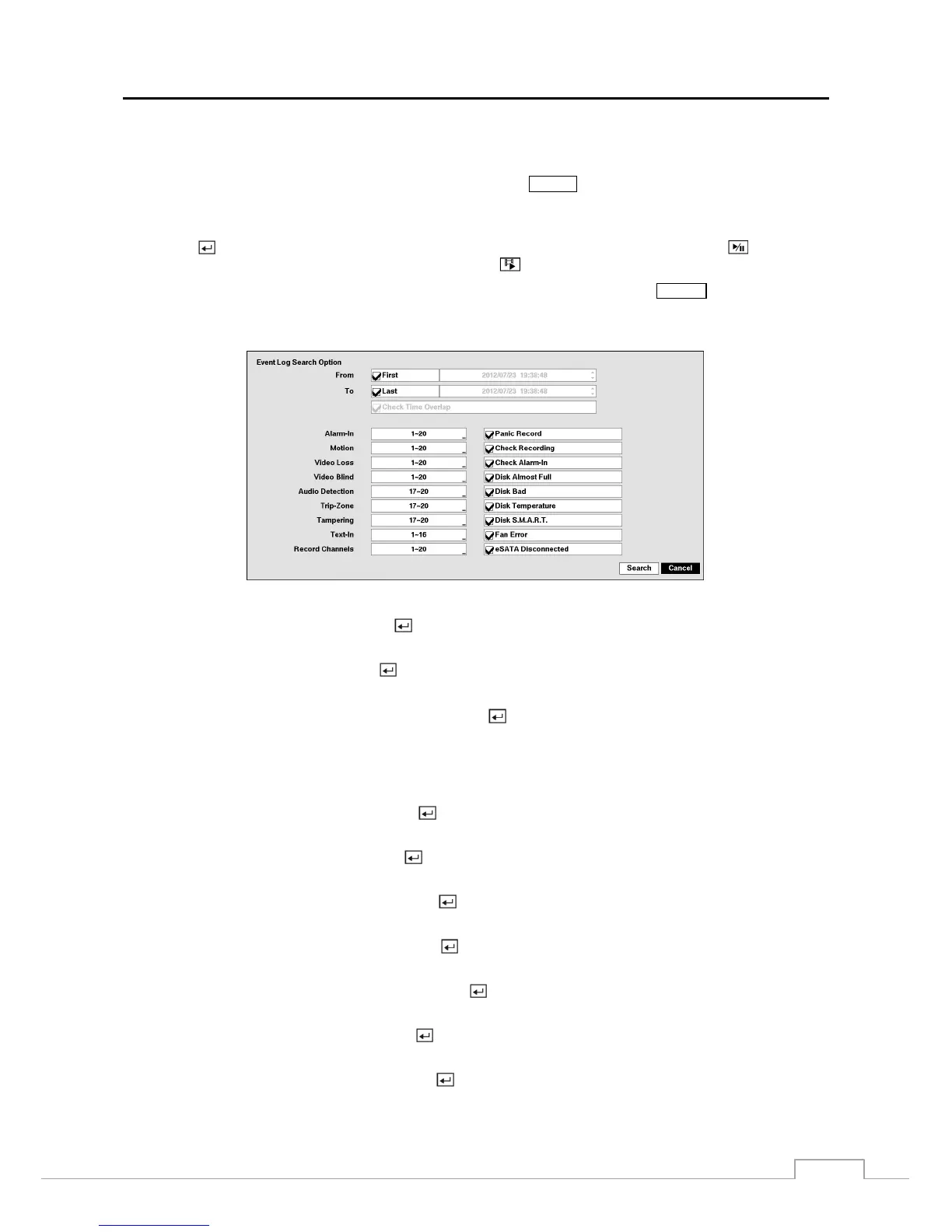 The Event Log Search screen can also be accessed by pressing the ALARM button unless there is an alarm. There is