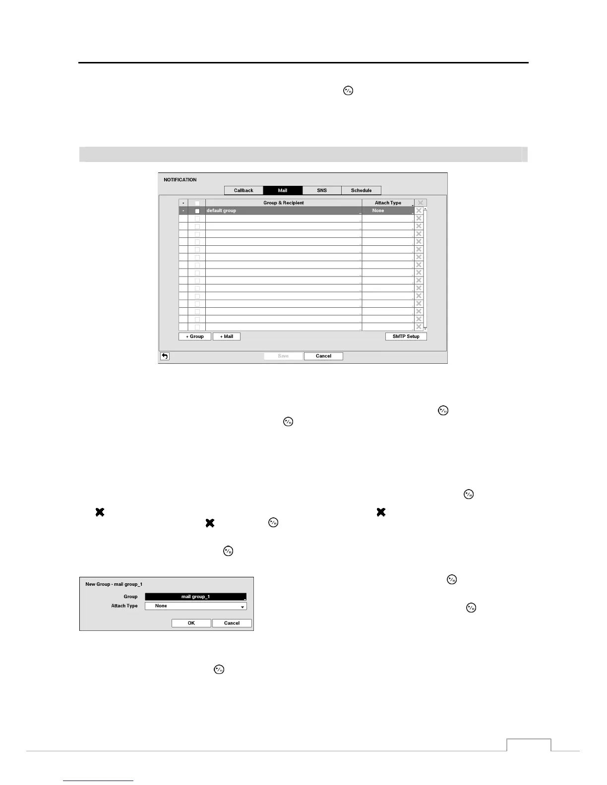 The DVR can be set up to send an email when an event occurs. The Mail Group and Recipient can be turned On or Off