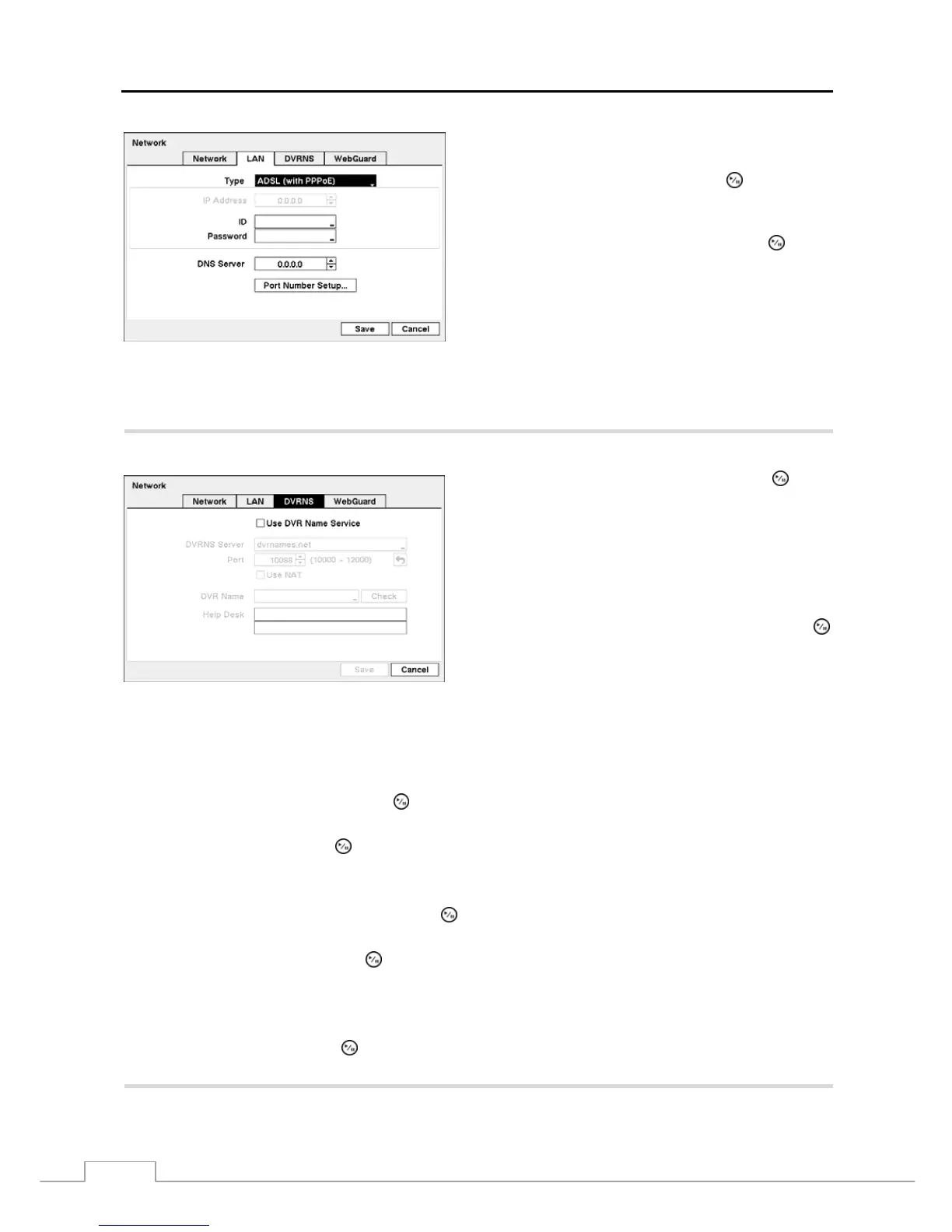 Highlight the box beside Port and press the button. Set the port number of the DVRNS server using the Up and