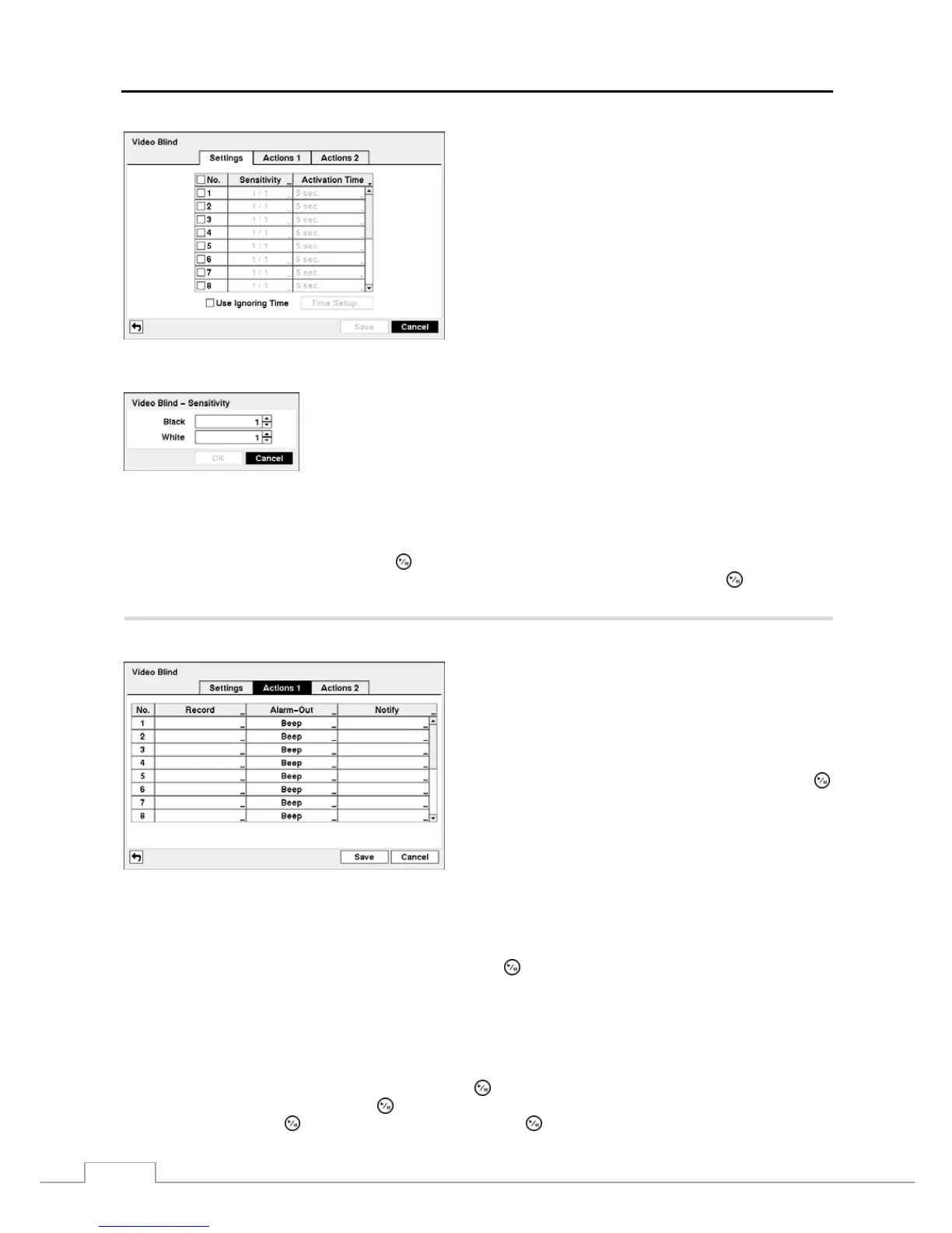 Highlight the Actions 1 and Actions 2 tabs and the Video Blind Actions 1 and Actions 2 screens display.