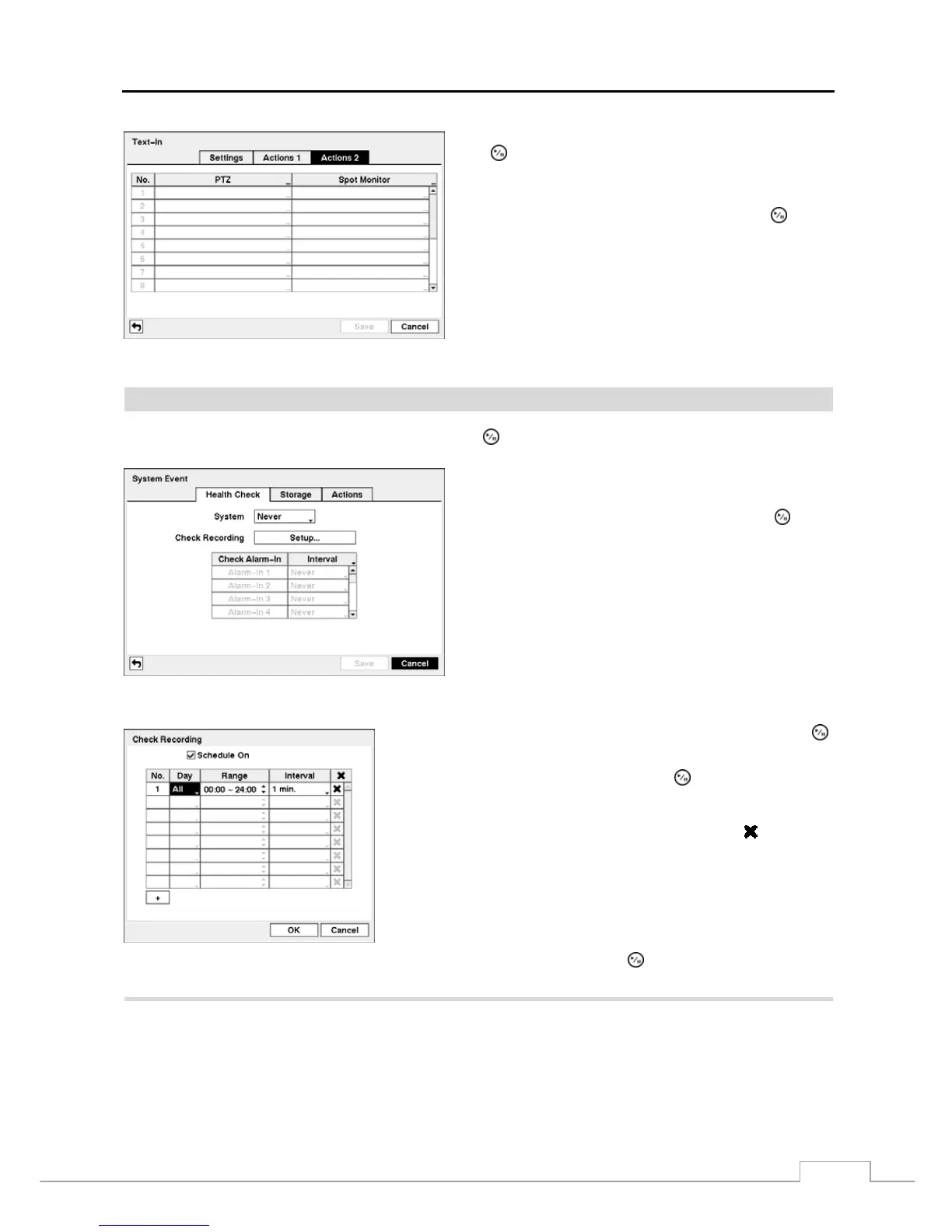 interval that you want the DVR to run self-diagnostics on Alarm Inputs. You can select from 1 hr. to 30 days or Never.