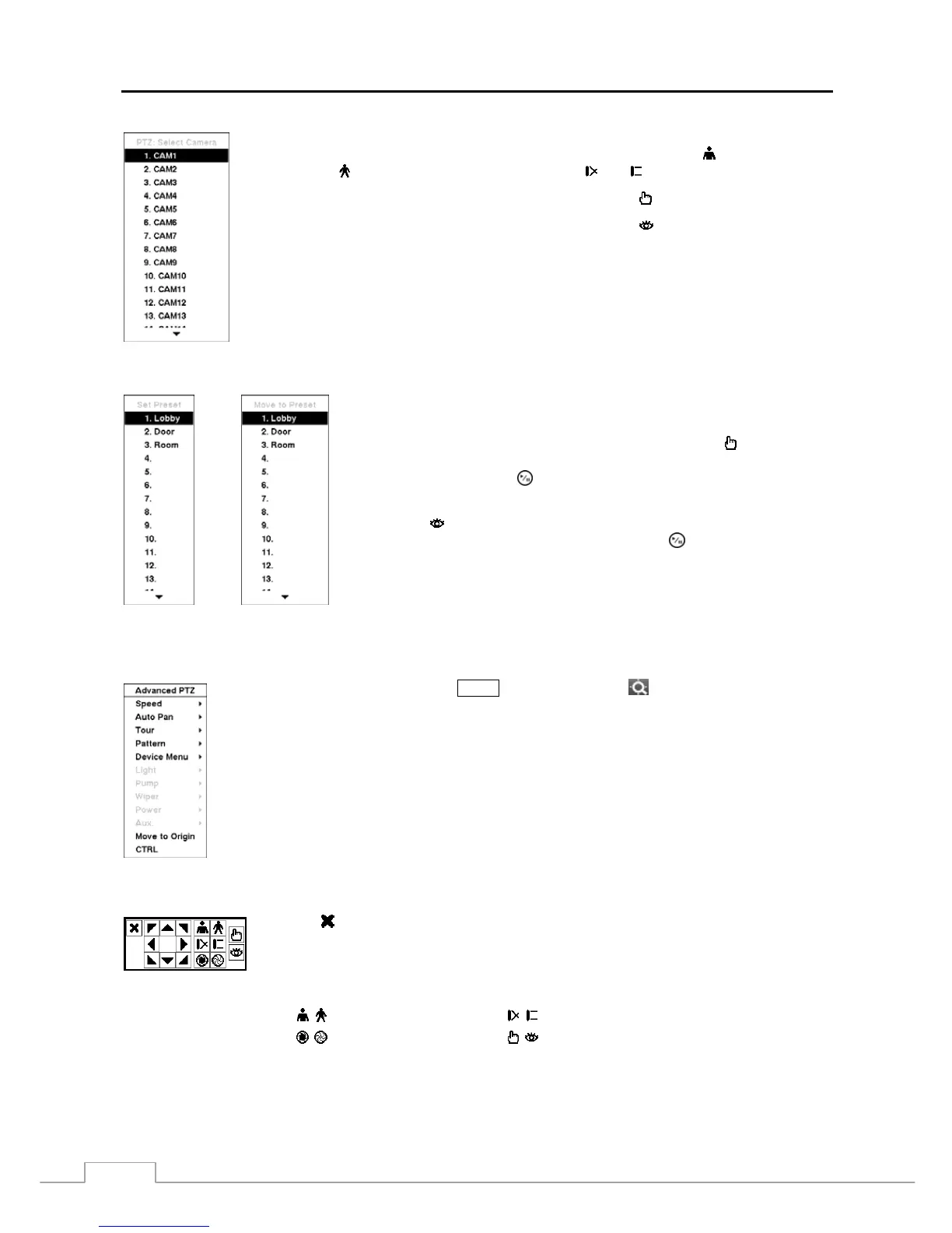 You can establish preset positions for PTZ cameras. Press the to establish Presets.