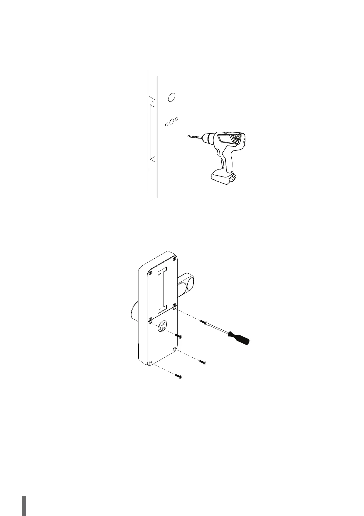 Following the markings previously made, drill the through holes to be used in the lock assembly. Use the drill bits specified in the installation template. The holes