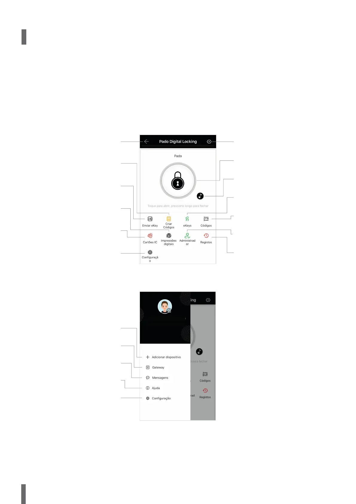 aplicativo Pado digital locking. As funções de cada ícone presente na interface do aplicativo estão descritas a seguir:
