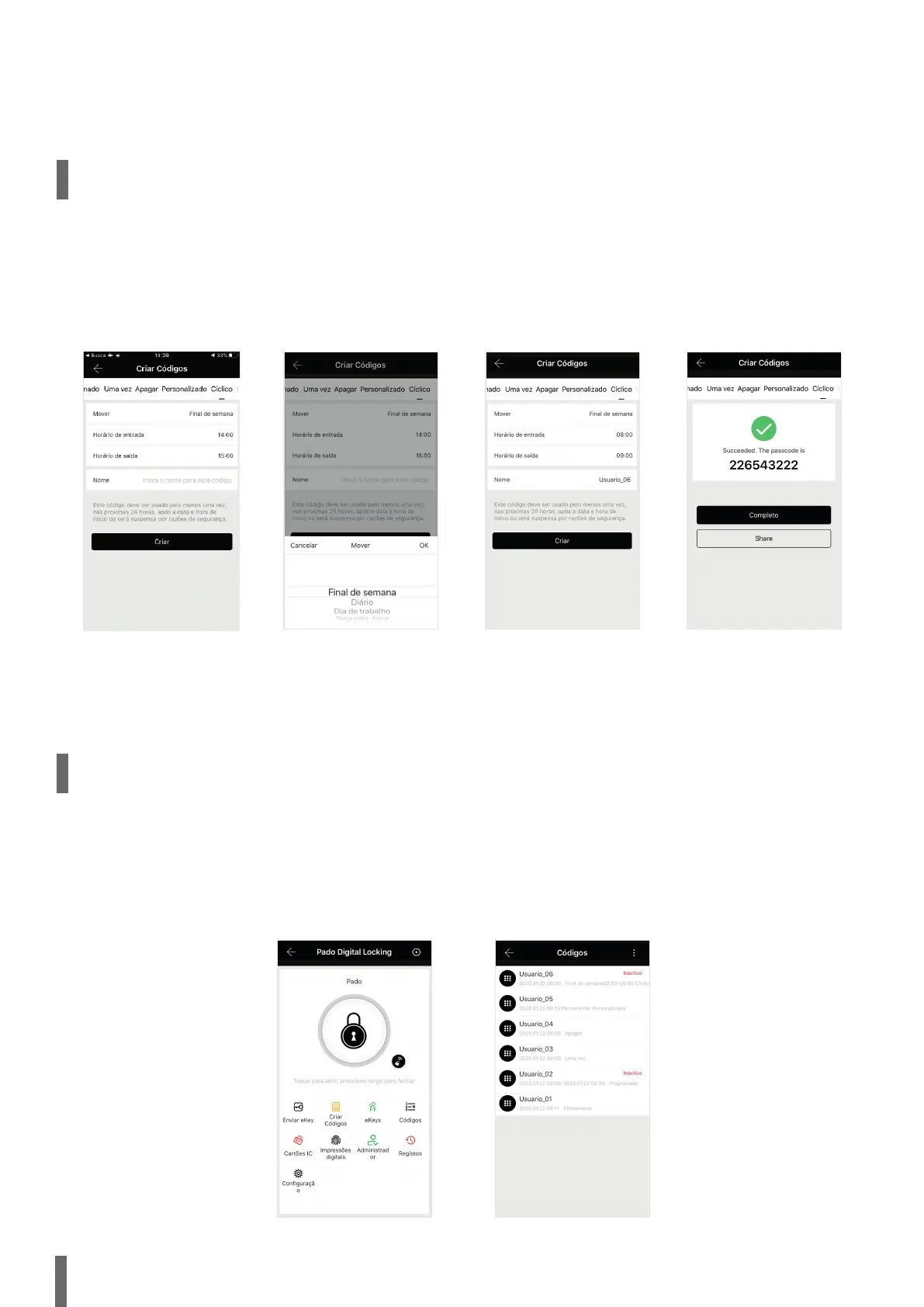As senhas cadastradas podem ser visualizadas na função “Códigos”, disponível no menu principal de controle da fechadura. O modo de