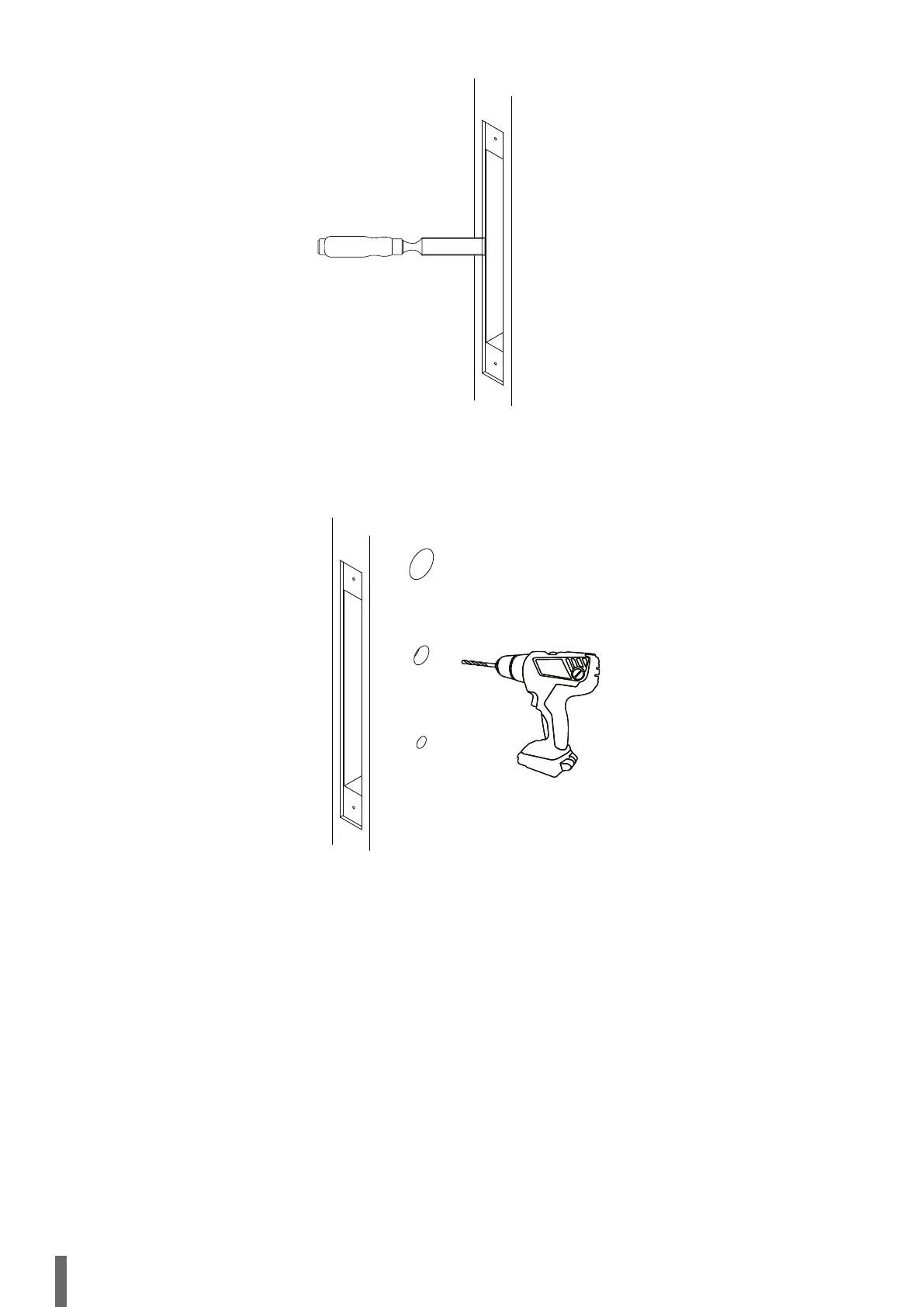 Following the markings previously made, drill the through holes to be used in the lock assembly. Use the drill bits specified in the installation template. The holes
