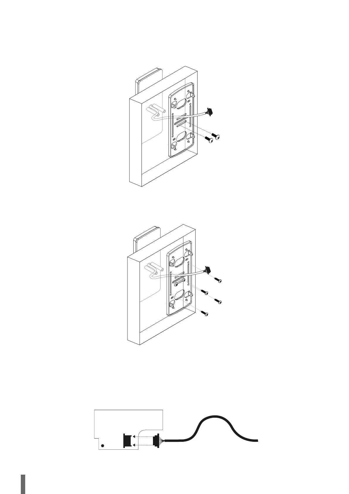 Pelo lado interno, posicione a chapa de fixação, transpassando a fiação pelo rasgo superior. Parafuse-a utilizando os dois parafusos M5 x