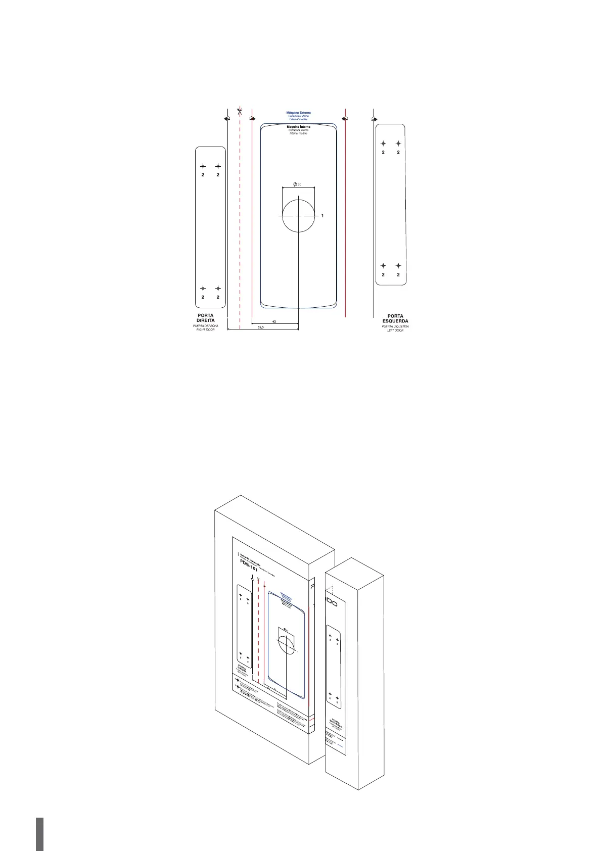 de instalação, nas regiões indicadas. A linha continua vermelha representa a extremada da porta. Já a linha continua preta a extremidade do