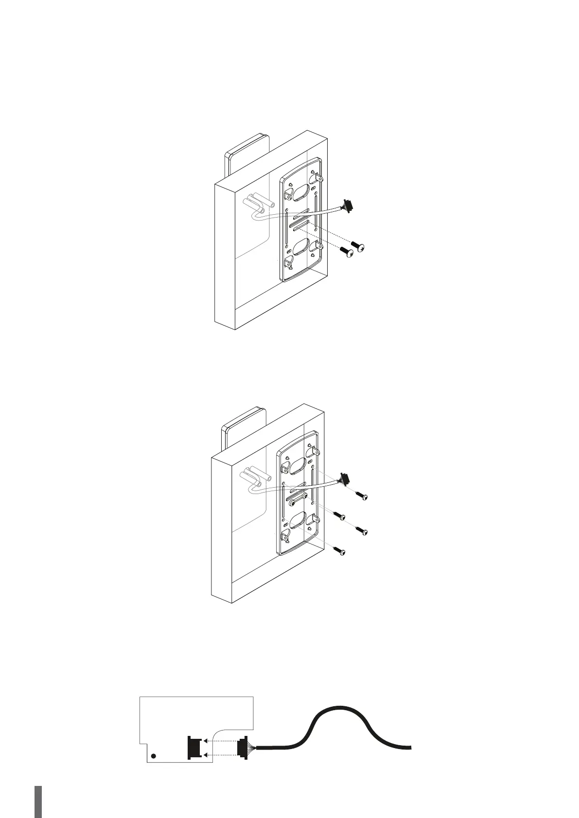 On the inside, position the fixation plate, overpassing the wiring by the central slot. Screw it using the two M5 x 25 or M5 x 15 screws, depending on the door thickness in which
