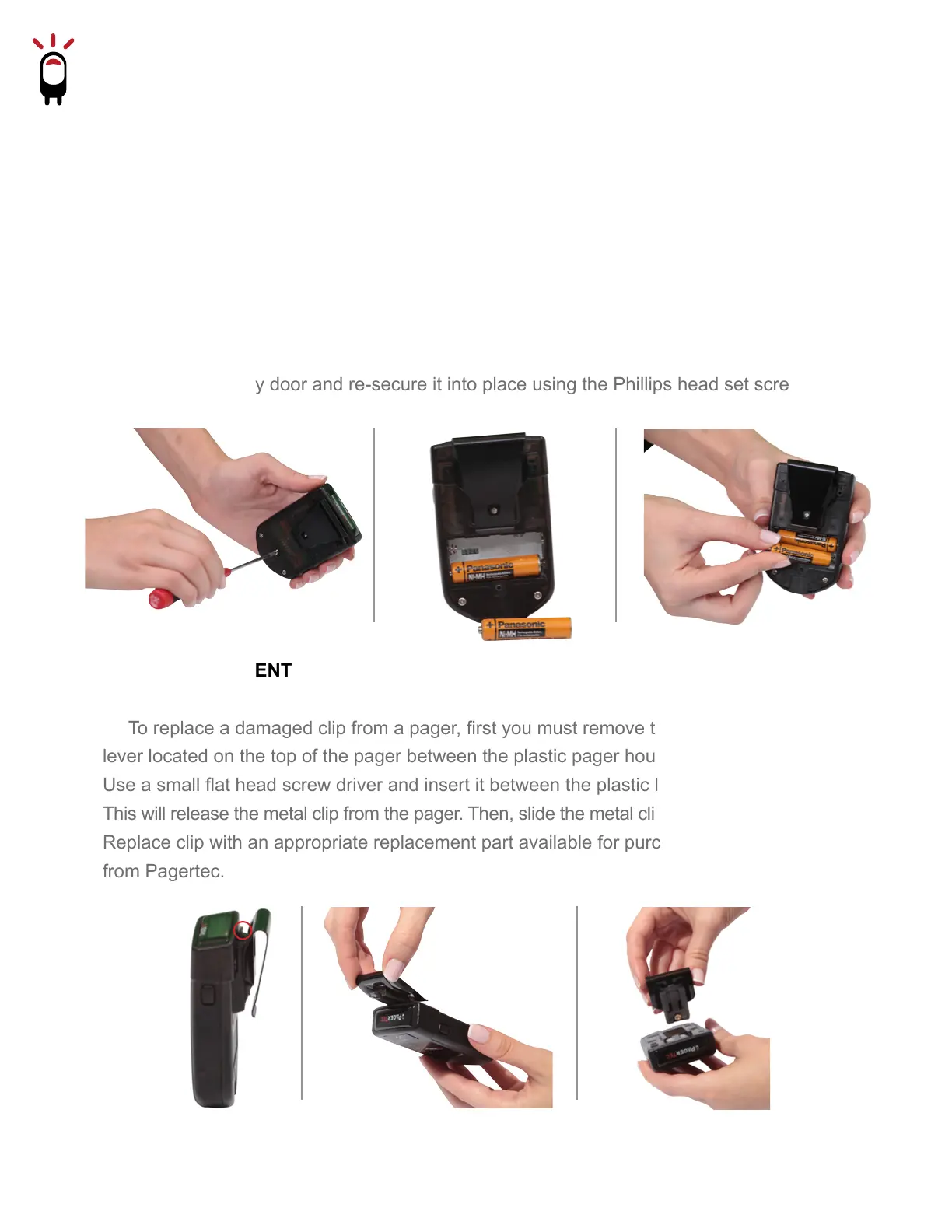 screw from the rear of the pager using a small Phillips head screwdriver. Lift the battery