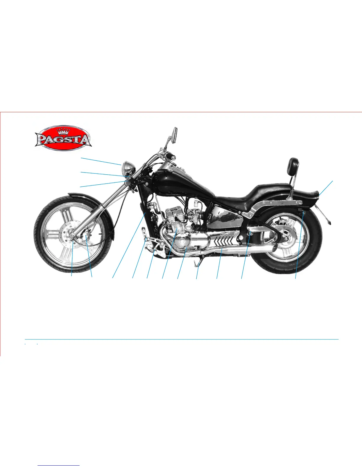 1. Front Headlight 2. Front left turn signal 3. Side reflector 4. Front brake disc 5. Front brake pump