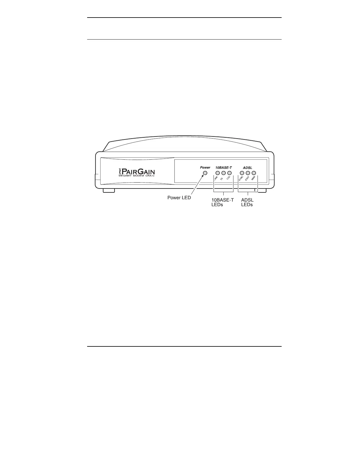 The Megabit Modem CRA-C front panel has LEDs that show status for power